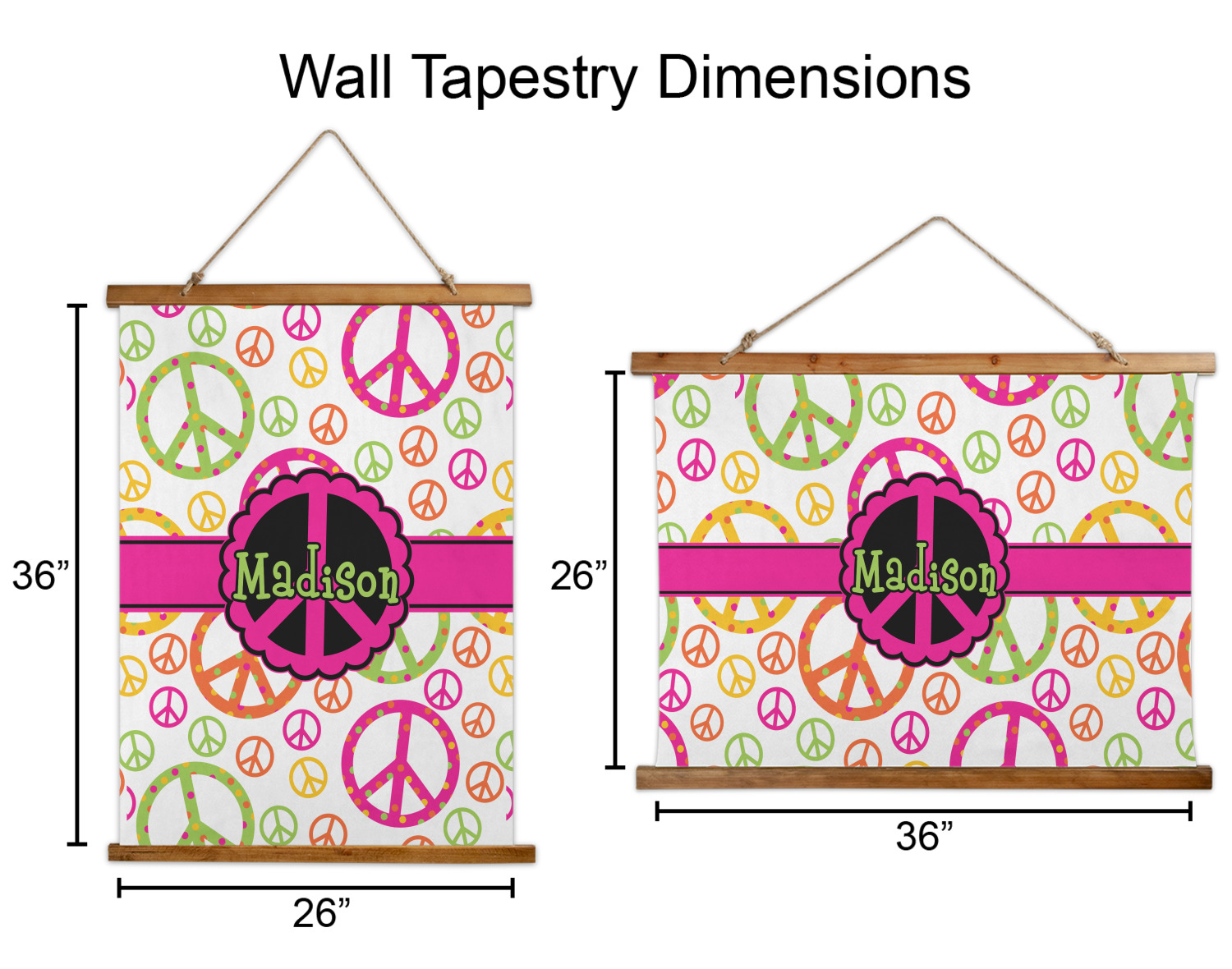 Made in two different orientations - portrait or landscape - both are 26" x 36". Your design is printed on a high quality polyester fabric with hemmed edges. The wood on the top and bottom of the tapestry is 1.25" tall and 0.25" thick and there are two pieces on top and bottom which sandwich the fabric.