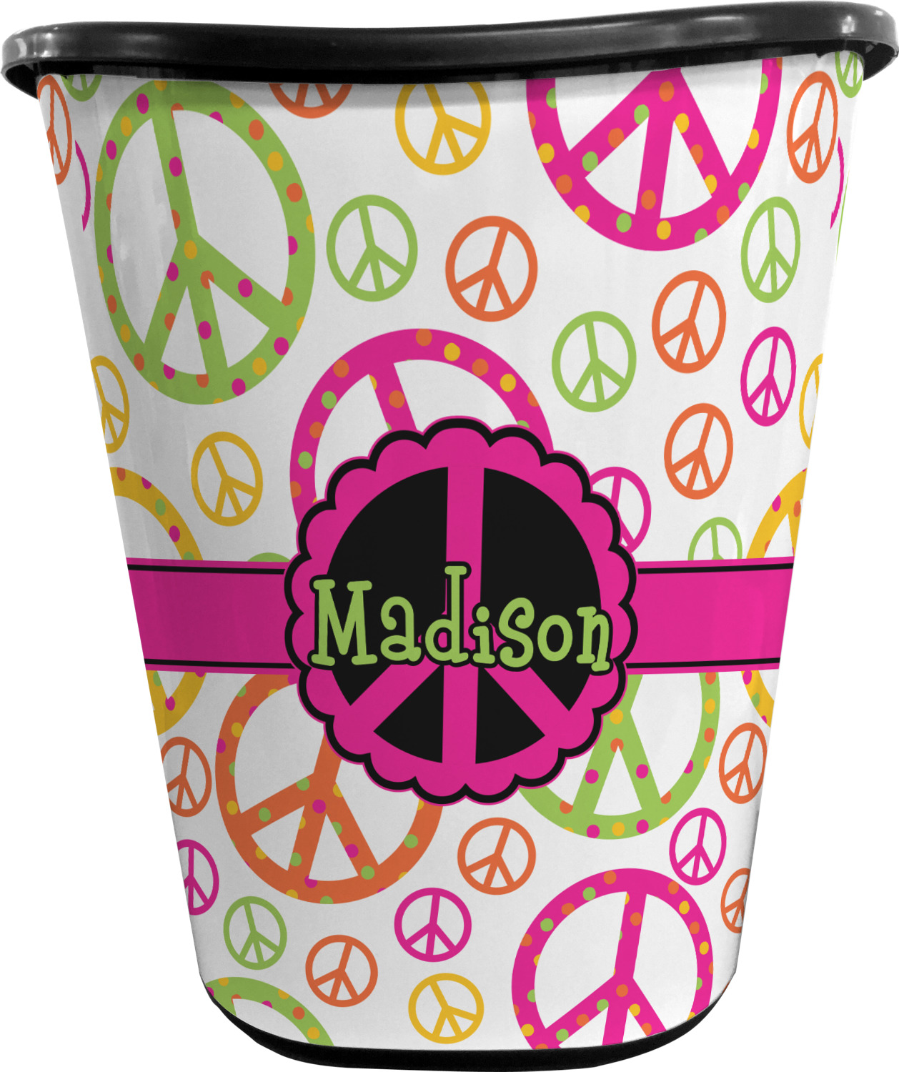 The design has a classic hot pink ribbon trimmed with black, and the label is a beautiful scalloped peace sign in black and hot pink. Personalize of your choice is done in a beautiful lime green color outlined in black.