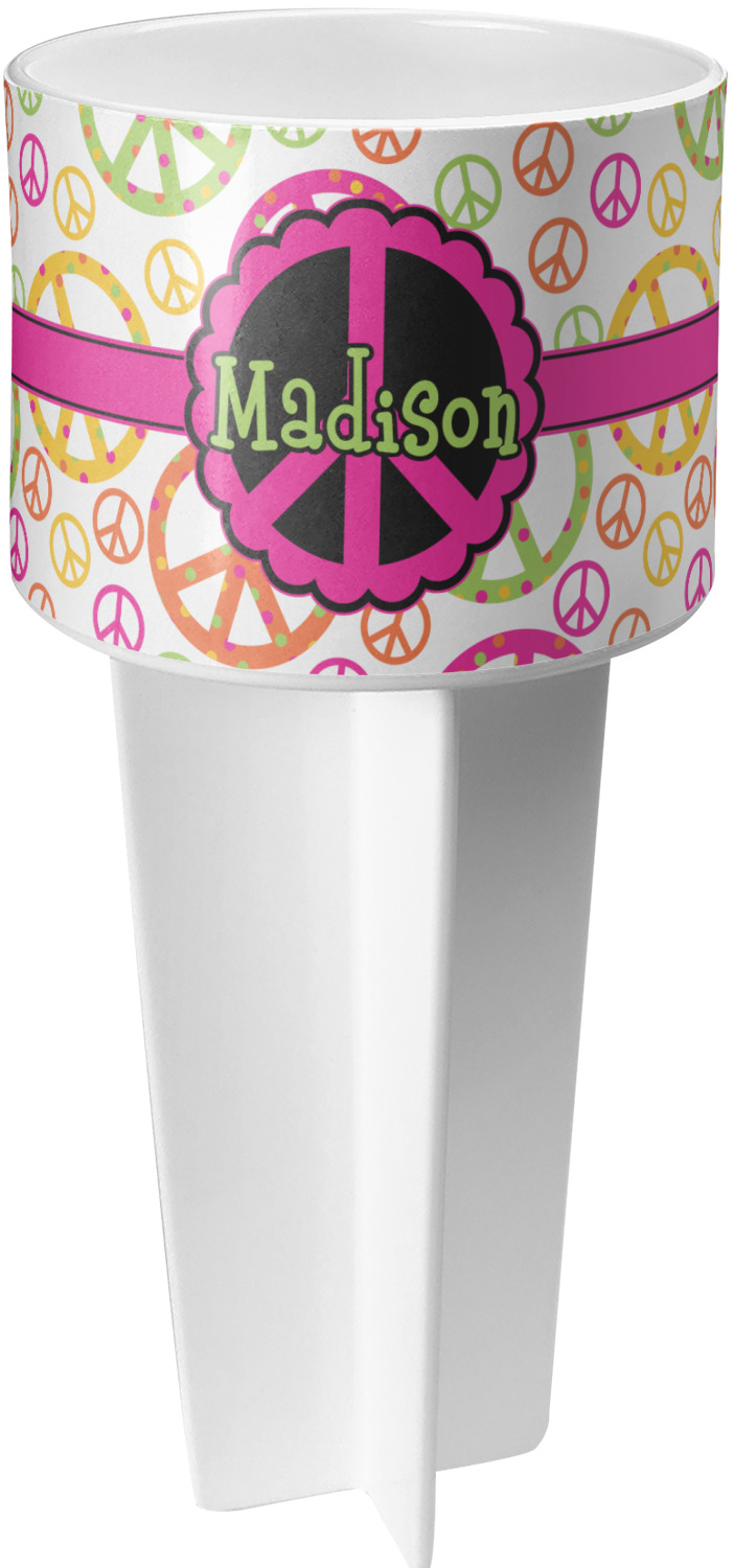 This cup holder has a large stake at its bottom that anchors it to the sand or ground below, while the cup holder rests above the stake. The entire drink holder is made of durable plastic and displays your customization around the cup holder portion. We sell these personalized beach spikers in two different colors: black and white.
