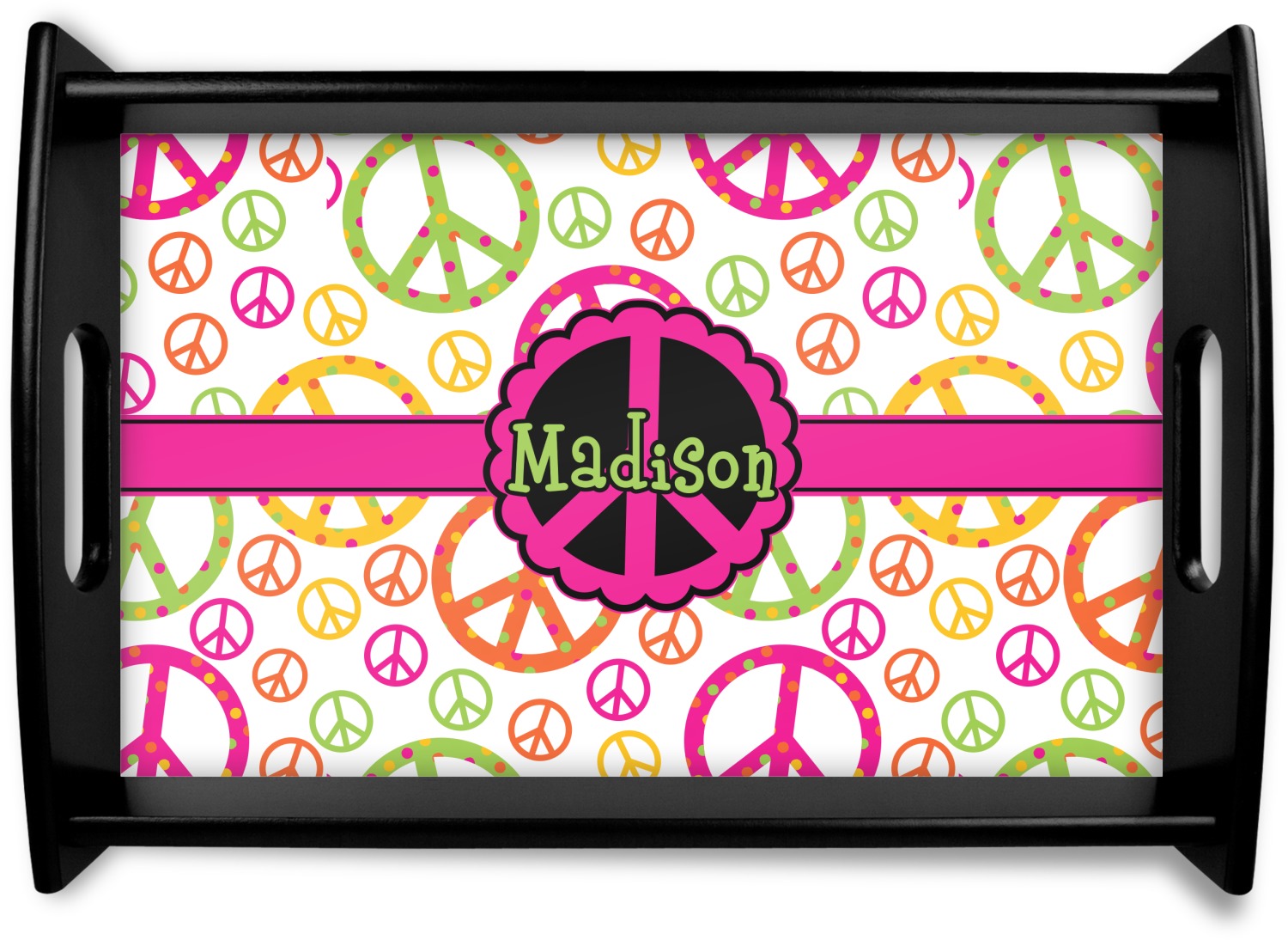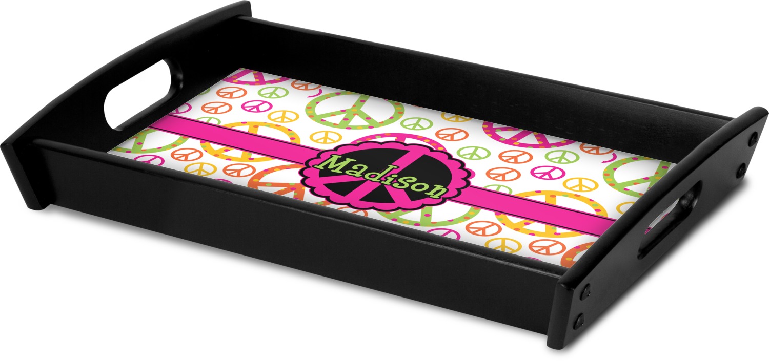 This serving tray with handles features square edges and two rounded sides, creating a very modern look. Each side is fabricated from a beautifully cut, natural wood. The bottom of the interior of the tray displays your customized design in bright, vibrant color. The tray is sold in both a black color and a natural wood look. Each variation of the wood serving tray has two sizes: Small, which is 14" x 10" x 2.25", and Large, which is 19.5" x 13.5" x 2.75".