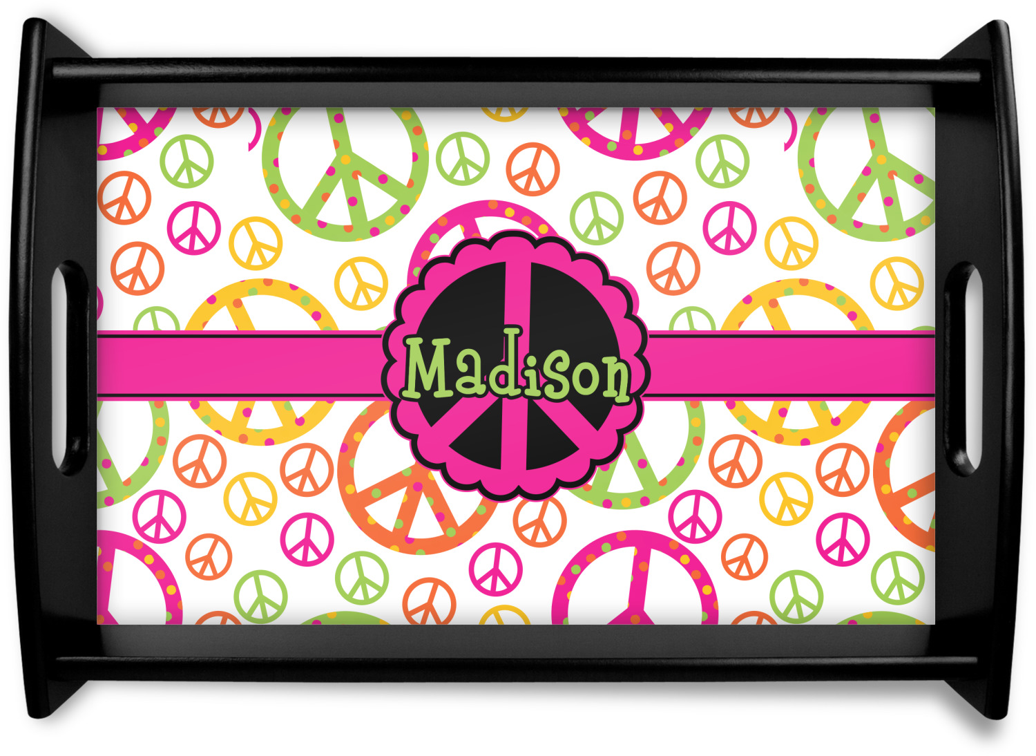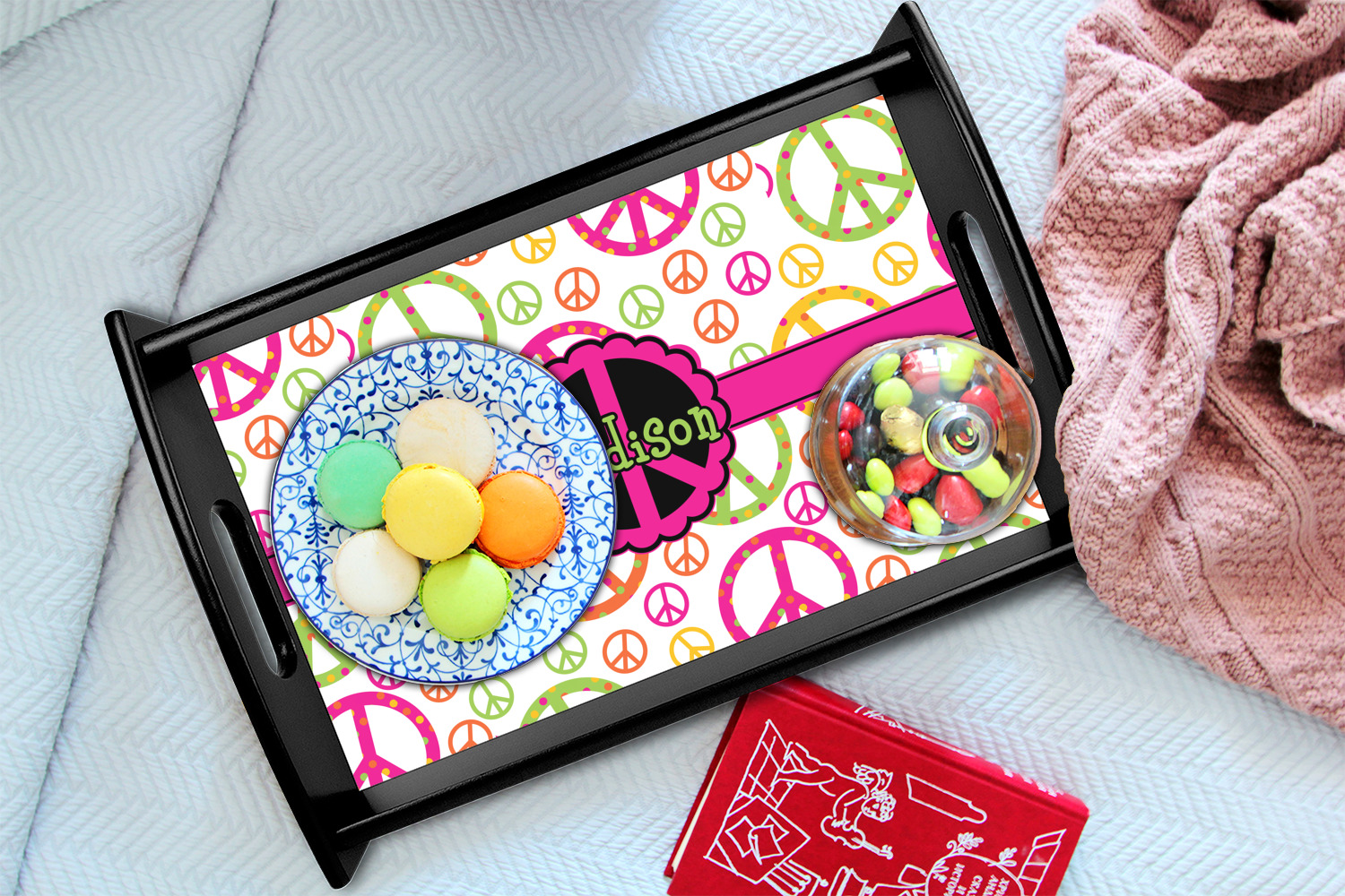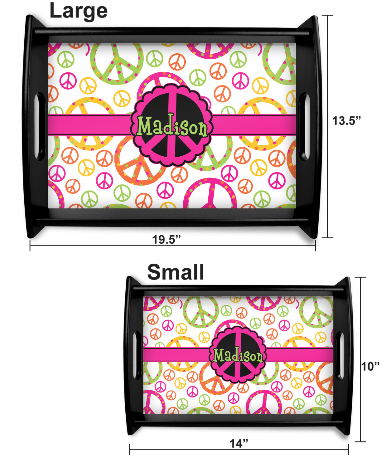 This serving tray with handles features square edges and two rounded sides, creating a very modern look. Each side is fabricated from a beautifully cut, natural wood. The bottom of the interior of the tray displays your customized design in bright, vibrant color. The tray is sold in both a black color and a natural wood look. Each variation of the wood serving tray has two sizes: Small, which is 14" x 10" x 2.25", and Large, which is 19.5" x 13.5" x 2.75".