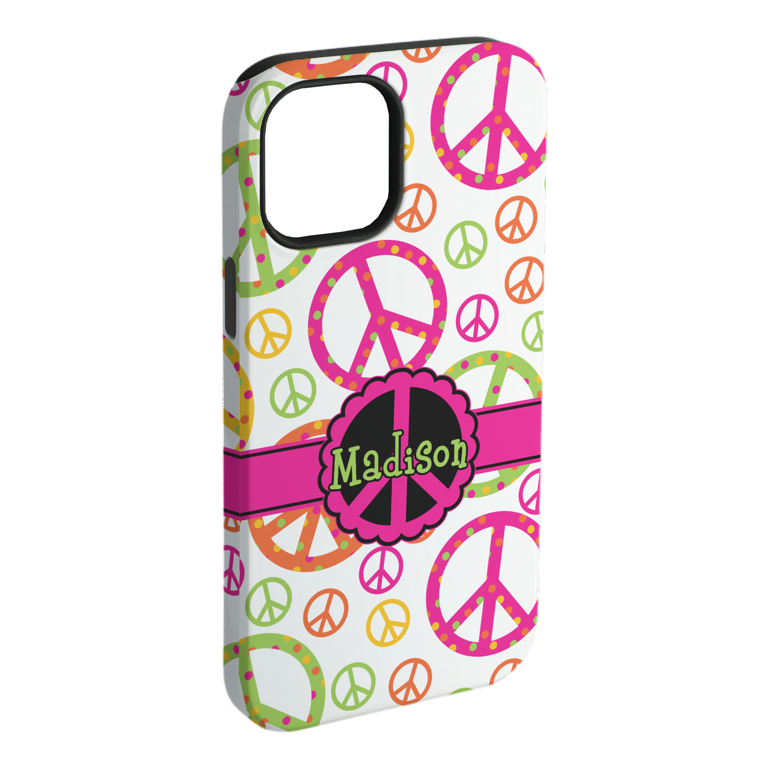 The design has a classic hot pink ribbon trimmed with black, and the label is a beautiful scalloped peace sign in black and hot pink. Personalize of your choice is done in a beautiful lime green color outlined in black.