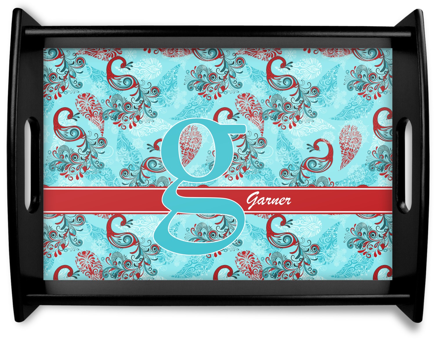 This serving tray with handles features square edges and two rounded sides, creating a very modern look. Each side is fabricated from a beautifully cut, natural wood. The bottom of the interior of the tray displays your customized design in bright, vibrant color. The tray is sold in both a black color and a natural wood look. Each variation of the wood serving tray has two sizes: Small, which is 14" x 10" x 2.25", and Large, which is 19.5" x 13.5" x 2.75".