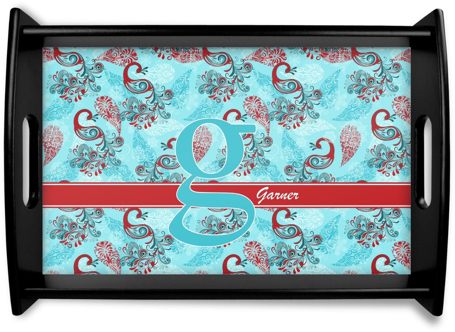 This serving tray with handles features square edges and two rounded sides, creating a very modern look. Each side is fabricated from a beautifully cut, natural wood. The bottom of the interior of the tray displays your customized design in bright, vibrant color. The tray is sold in both a black color and a natural wood look. Each variation of the wood serving tray has two sizes: Small, which is 14" x 10" x 2.25", and Large, which is 19.5" x 13.5" x 2.75".