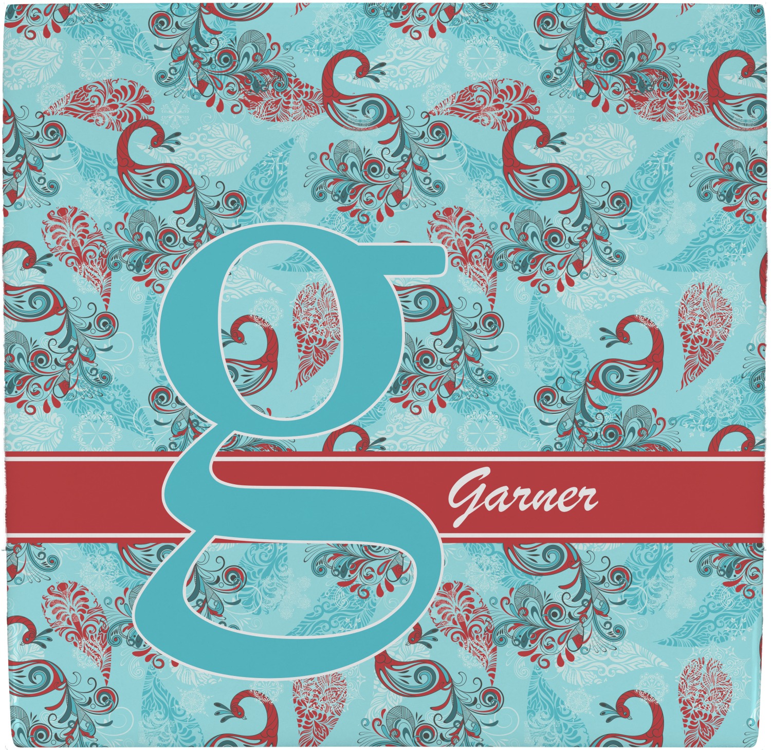 We chose to personalize with Initial and Name on the ribbon; we red for the ribbon, teal for the initial and white for the name. We have also chosen tone on tone herringbone design for our coordinating pattern and it looks simply beautiful (see bedding).
