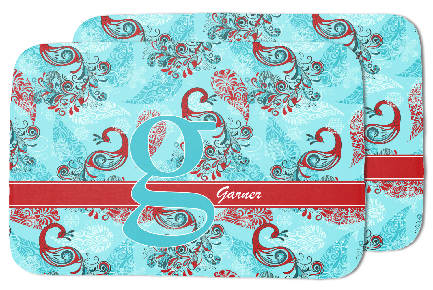 We chose to personalize with Initial and Name on the ribbon; we red for the ribbon, teal for the initial and white for the name. We have also chosen tone on tone herringbone design for our coordinating pattern and it looks simply beautiful (see bedding).