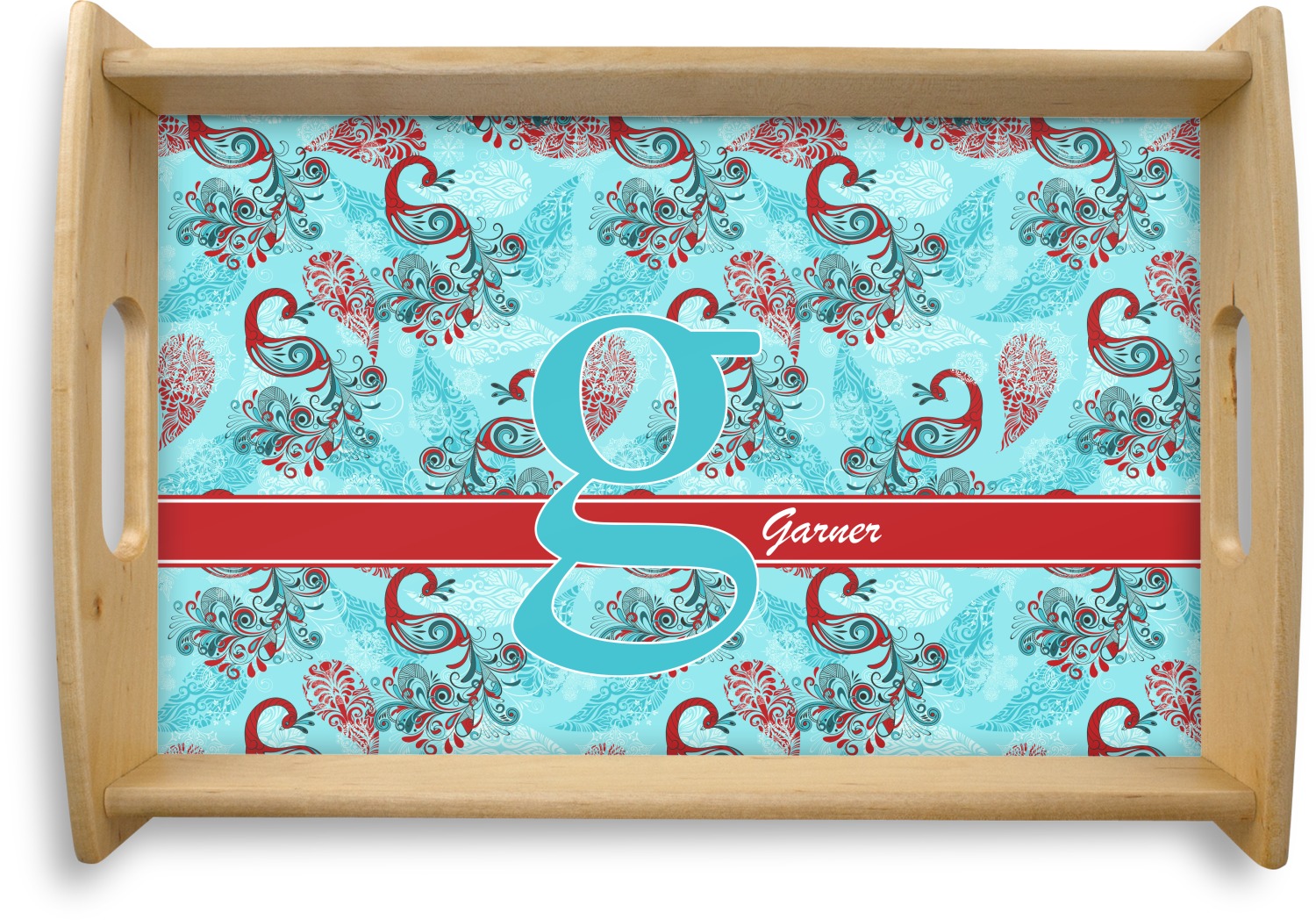 This serving tray with handles features square edges and two rounded sides, creating a very modern look. Each side is fabricated from a beautifully cut, natural wood. The bottom of the interior of the tray displays your customized design in bright, vibrant color. The tray is sold in both a black color and a natural wood look. Each variation of the wood serving tray has two sizes: Small, which is 14" x 10" x 2.25", and Large, which is 19.5" x 13.5" x 2.75".