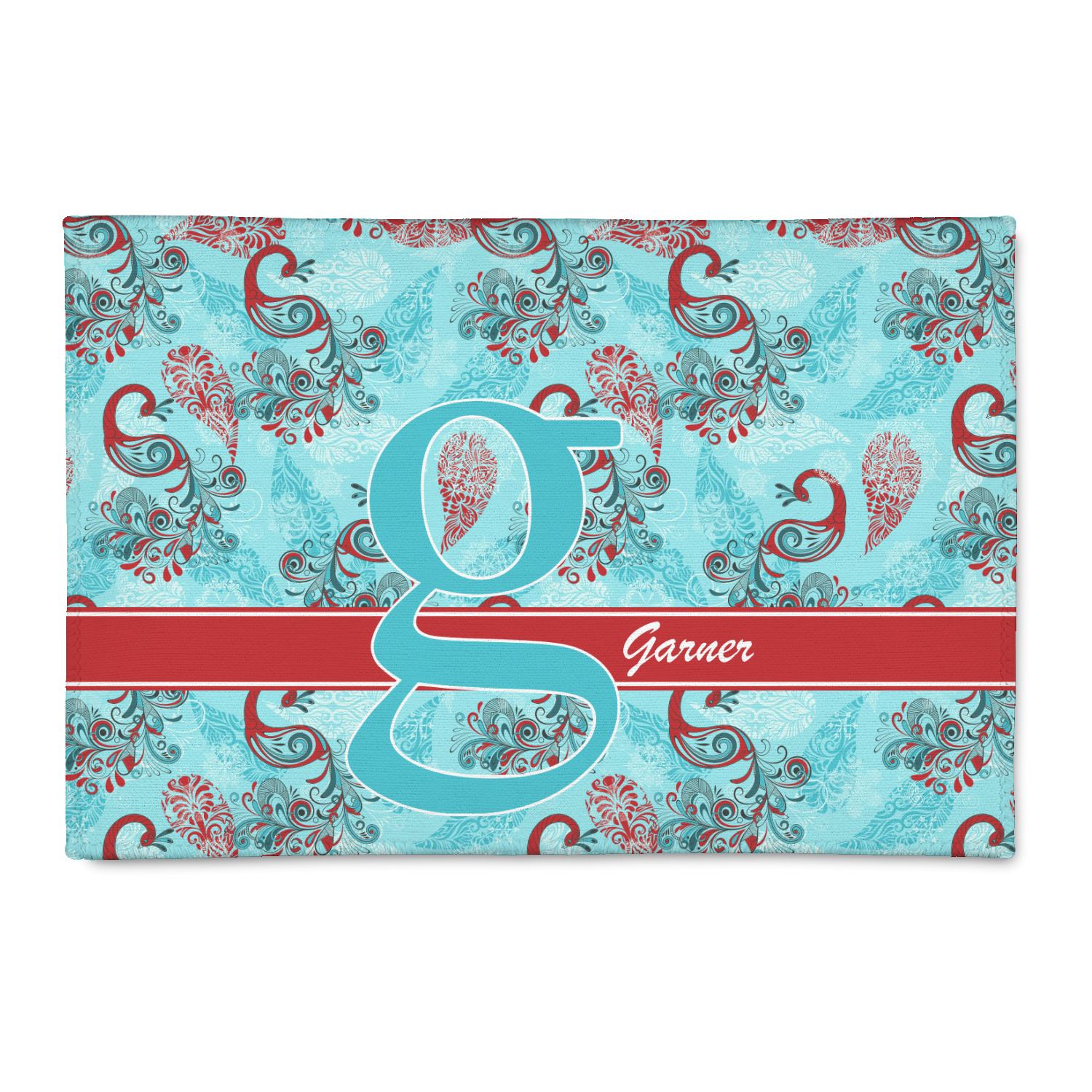 We chose to personalize with Initial and Name on the ribbon; we red for the ribbon, teal for the initial and white for the name. We have also chosen tone on tone herringbone design for our coordinating pattern and it looks simply beautiful (see bedding).