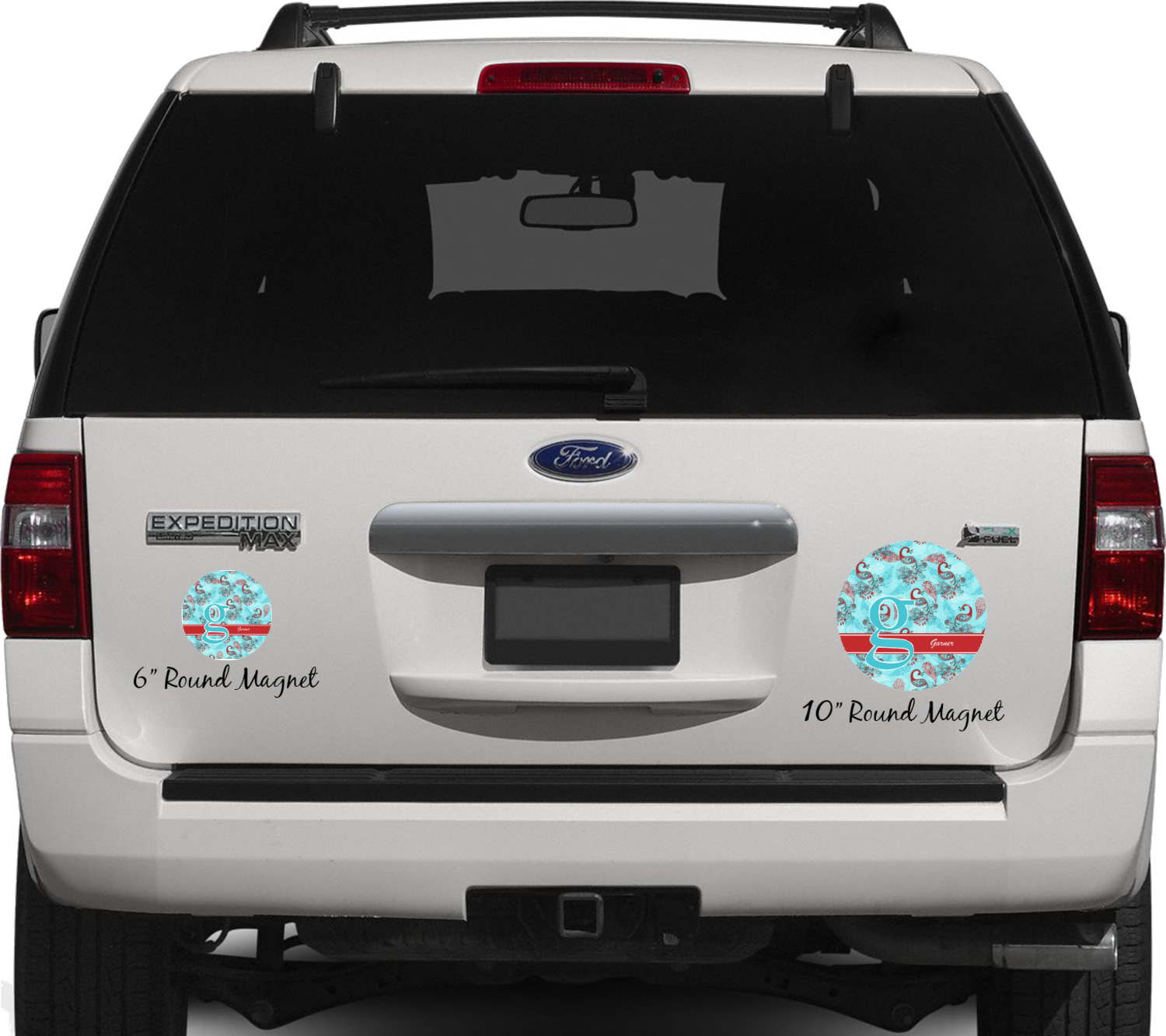 Your personalized car magnets are available for purchase in two shapes and two sizes. We carry round and square editions; each shape can either be 6 by 6 inches, or 10 by 10 inches, depending on your needs. Both versions are 1 millimeter thick, which is considered, within the industry, as the ideal thickness for automobile magnets. The magnetic car decals will adhere to any smooth, metal surface of your cars body, such as the trunk door or a side panel. However, please note that some vehicles are constructed from fiberglass bodies, which prevents the adhesion of anything magnetic. We advise that you test your vehicle before purchasing these magnets.