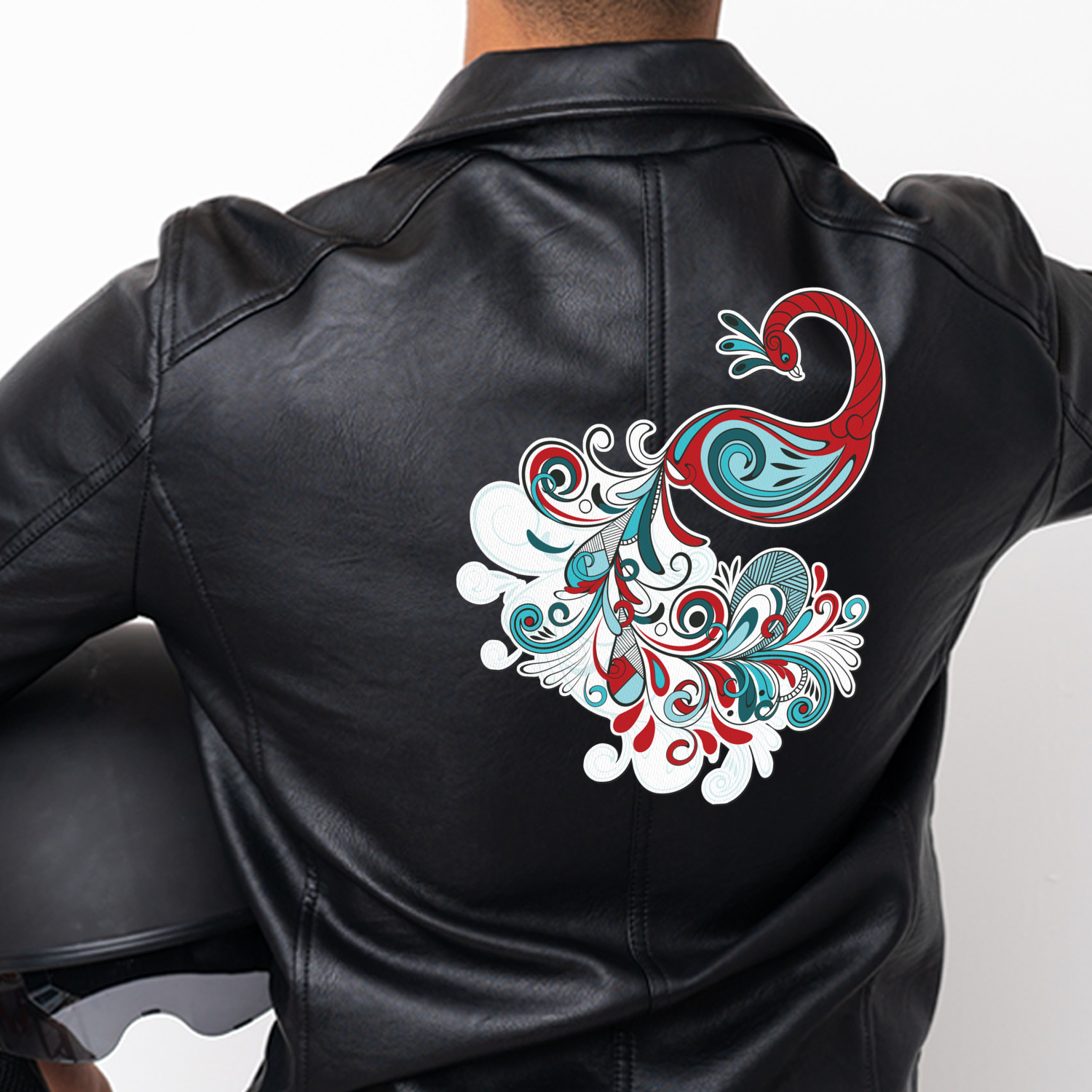 This peacock design is stunning. It has an beautifully illustrated peocock in teal and red, along with with some paisleys in the background.
