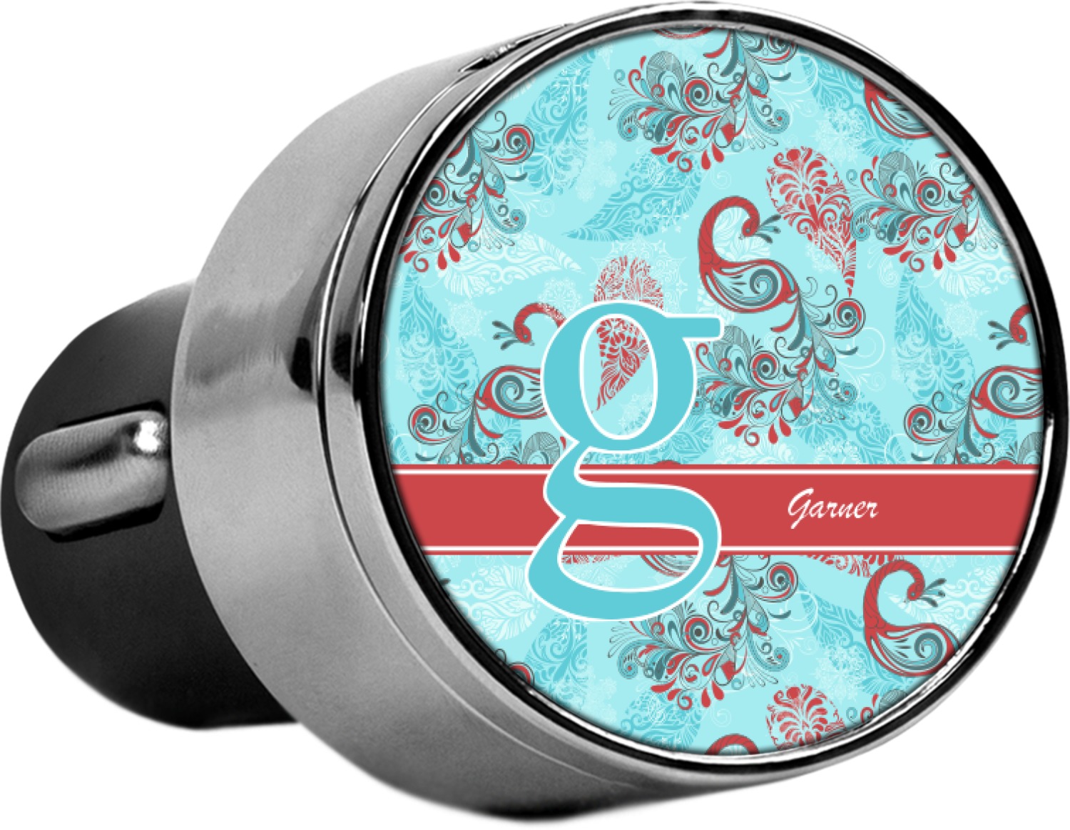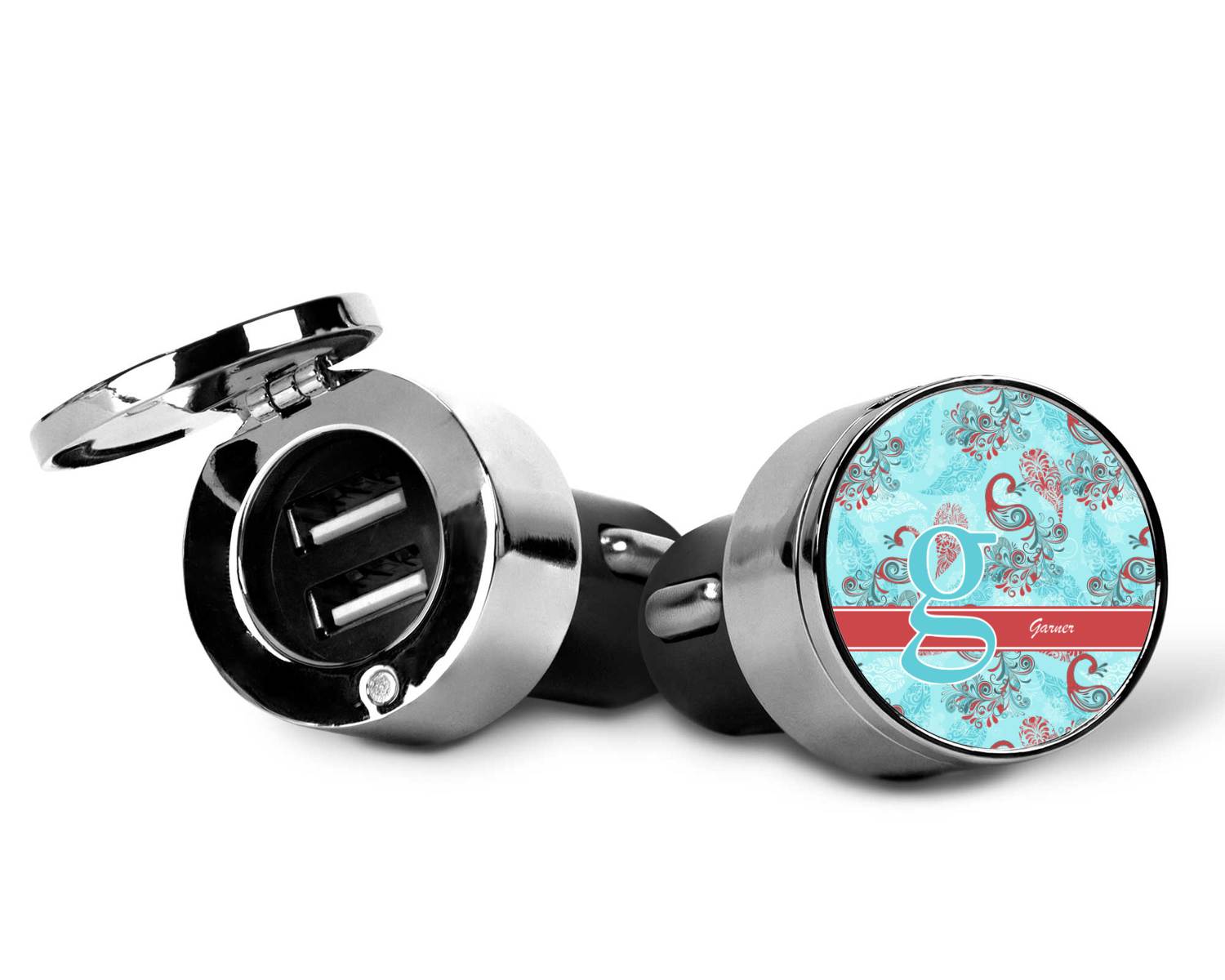 This car charger adapter converts your cars bland cigarette lighter into a decorative, personalized, and operational USB charging port. Made of solid, silver-plated metal, these chargers feature a flip-open lid that both displays your customized design and conceals two USB ports. The metal lid of the USB car charger adapter is 1.5" in diameter and seals due to a small, ingrained magnet on both the charger and its lid. The cigarette lighter insert, itself, is colored black.
