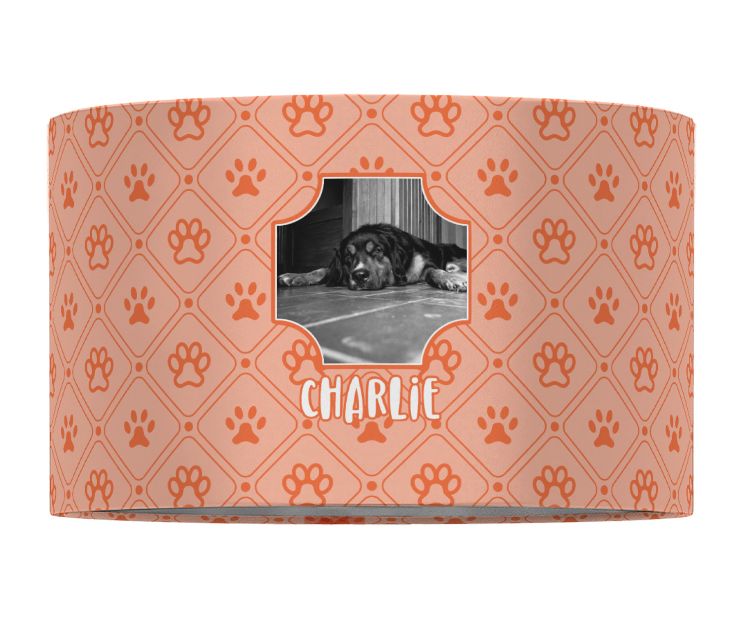 This design is a bright peach with accents of orange. In the middle, you can upload your favorite picture of your pet! It's a breeze with our design center. Underneath their picture, put their name or a fun saying. The background is filled with a fun pattern of pawprints and bones. This will be the perfect design for a sweet puppy.