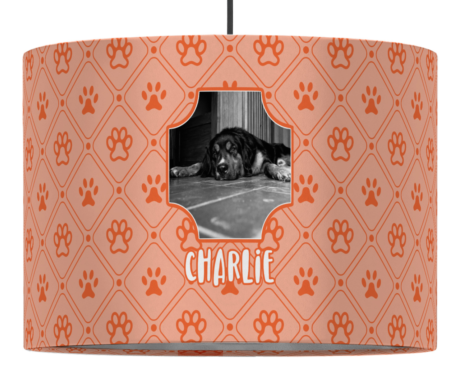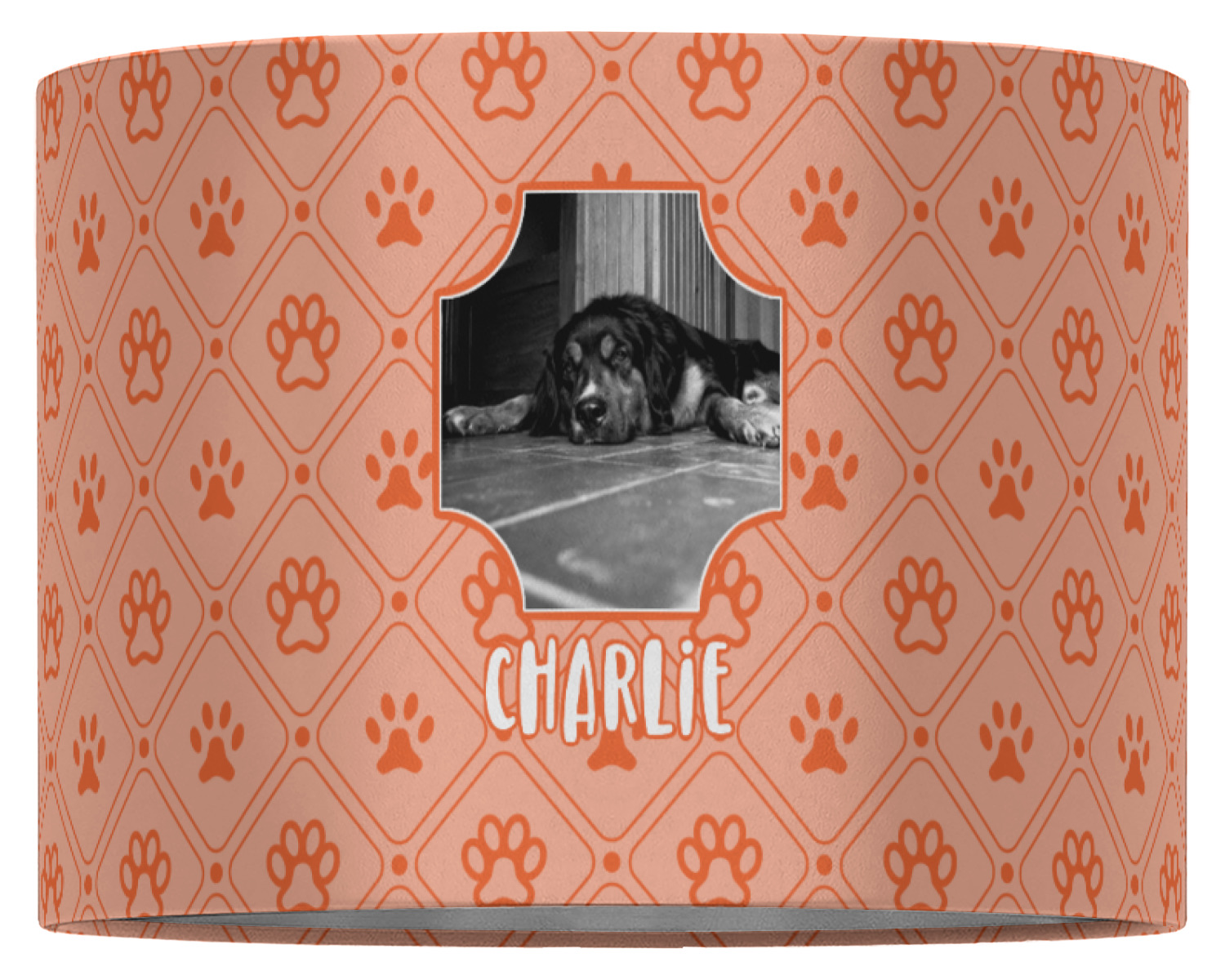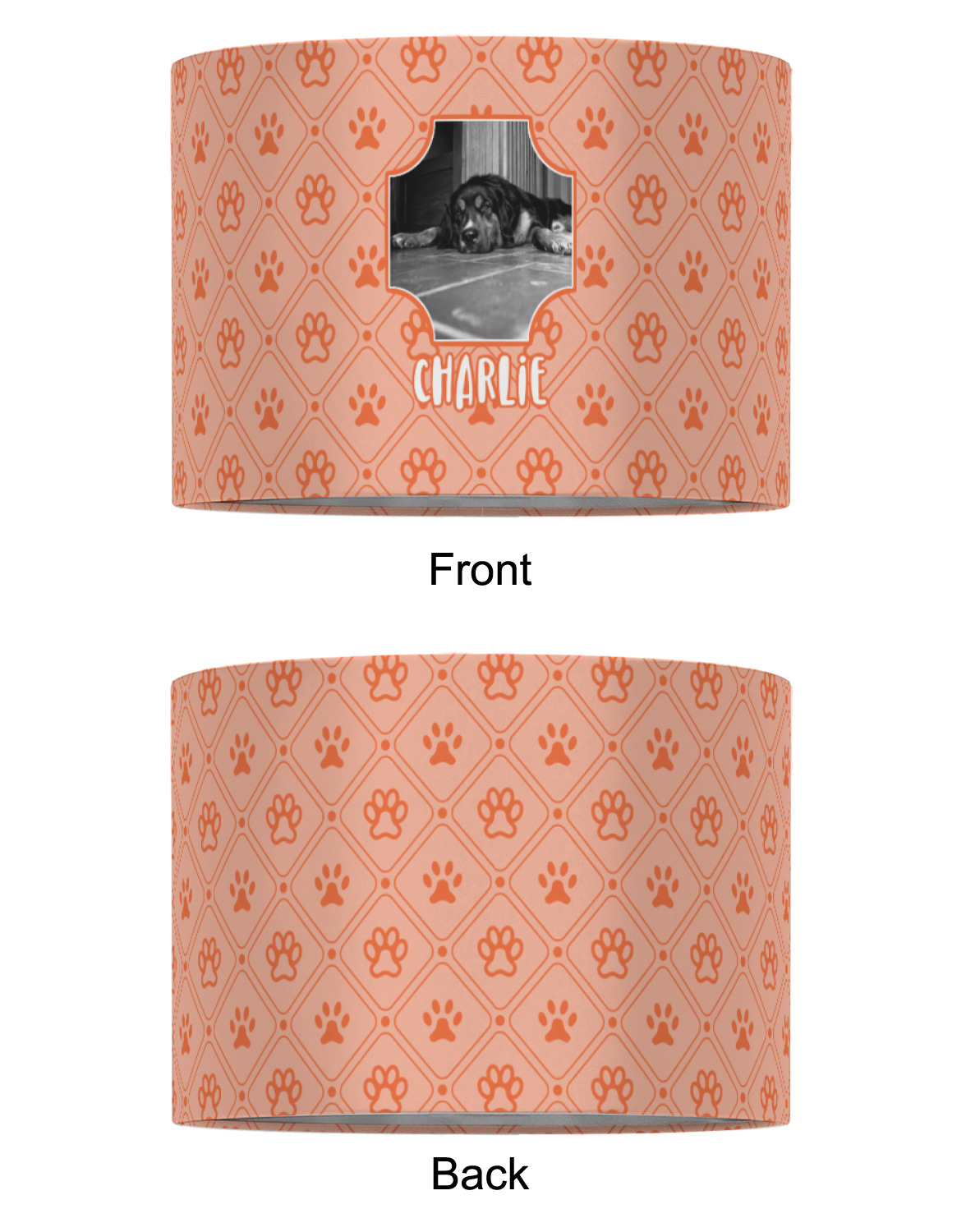 This design is a bright peach with accents of orange. In the middle, you can upload your favorite picture of your pet! It's a breeze with our design center. Underneath their picture, put their name or a fun saying. The background is filled with a fun pattern of pawprints and bones. This will be the perfect design for a sweet puppy.