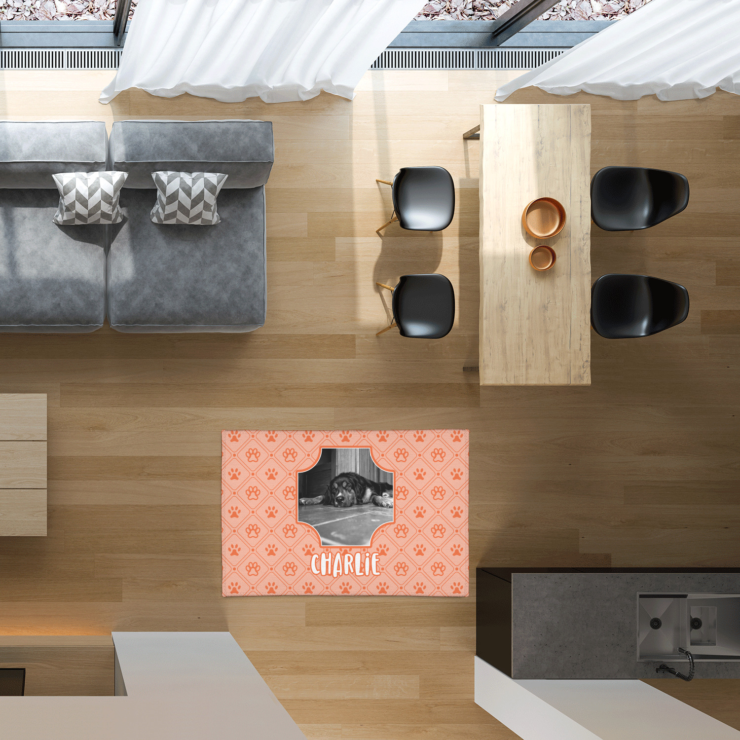 This design is a bright peach with accents of orange. In the middle, you can upload your favorite picture of your pet! It's a breeze with our design center. Underneath their picture, put their name or a fun saying. The background is filled with a fun pattern of pawprints and bones. This will be the perfect design for a sweet puppy.