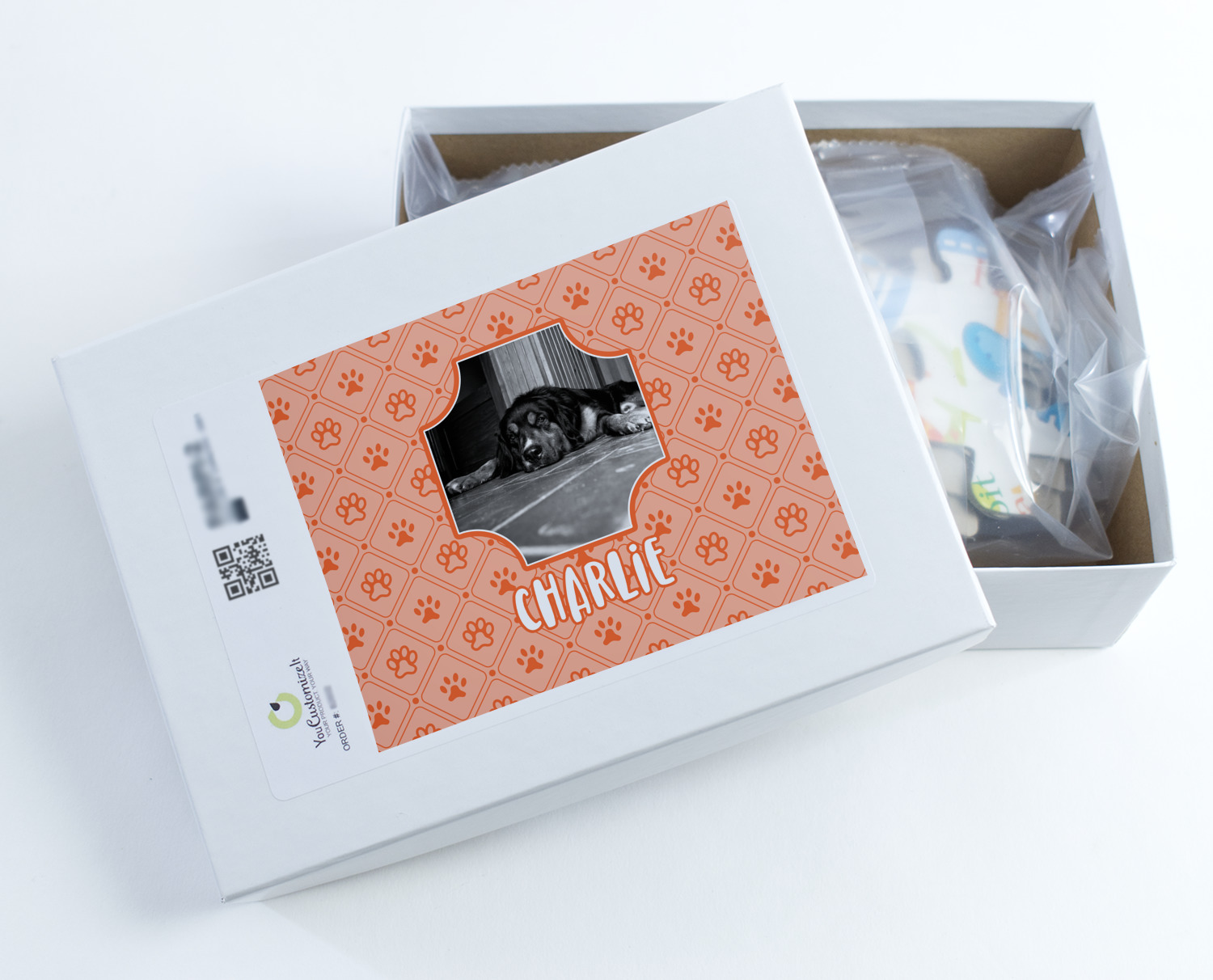 This design is a bright peach with accents of orange. In the middle, you can upload your favorite picture of your pet! It's a breeze with our design center. Underneath their picture, put their name or a fun saying. The background is filled with a fun pattern of pawprints and bones. This will be the perfect design for a sweet puppy.