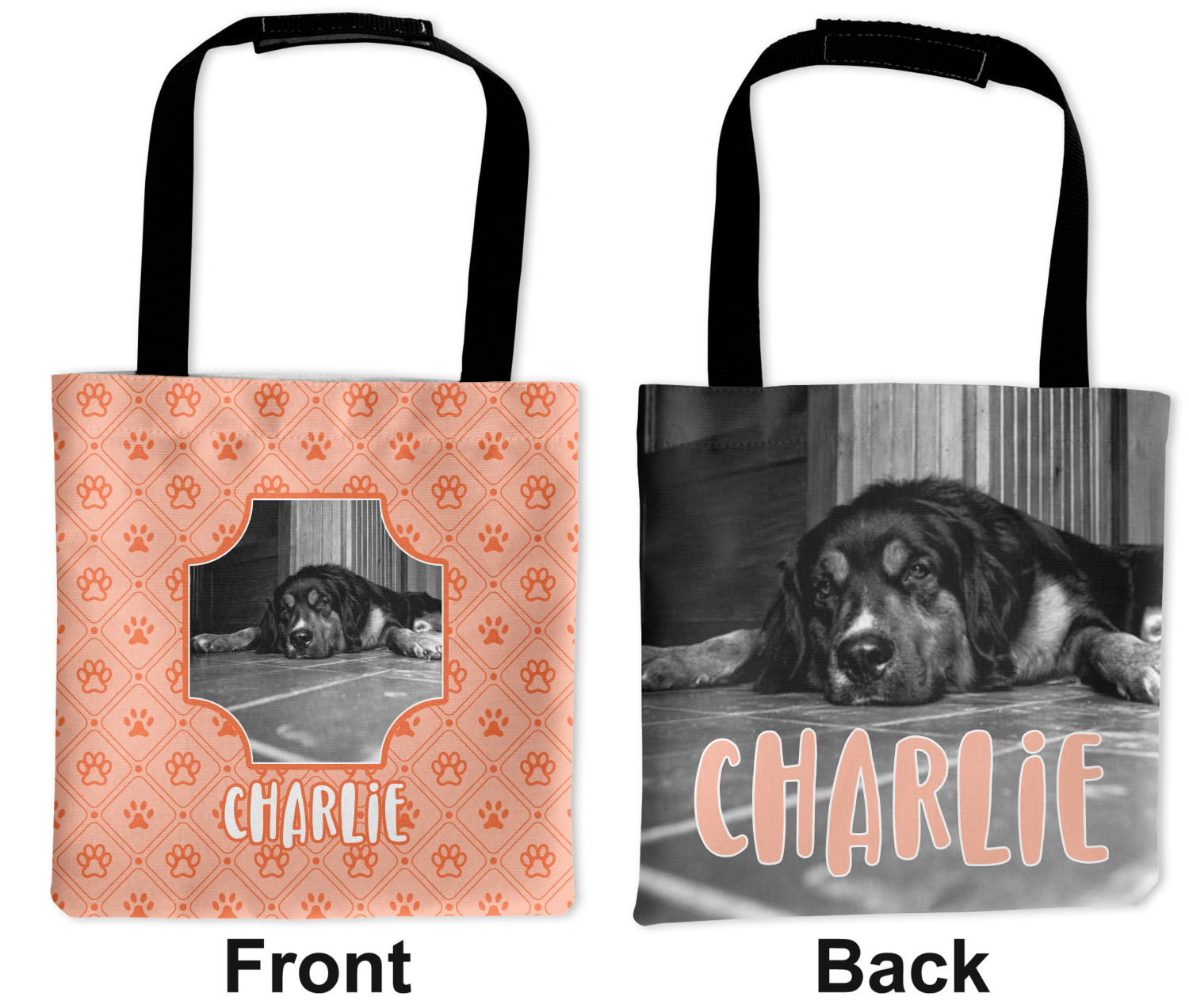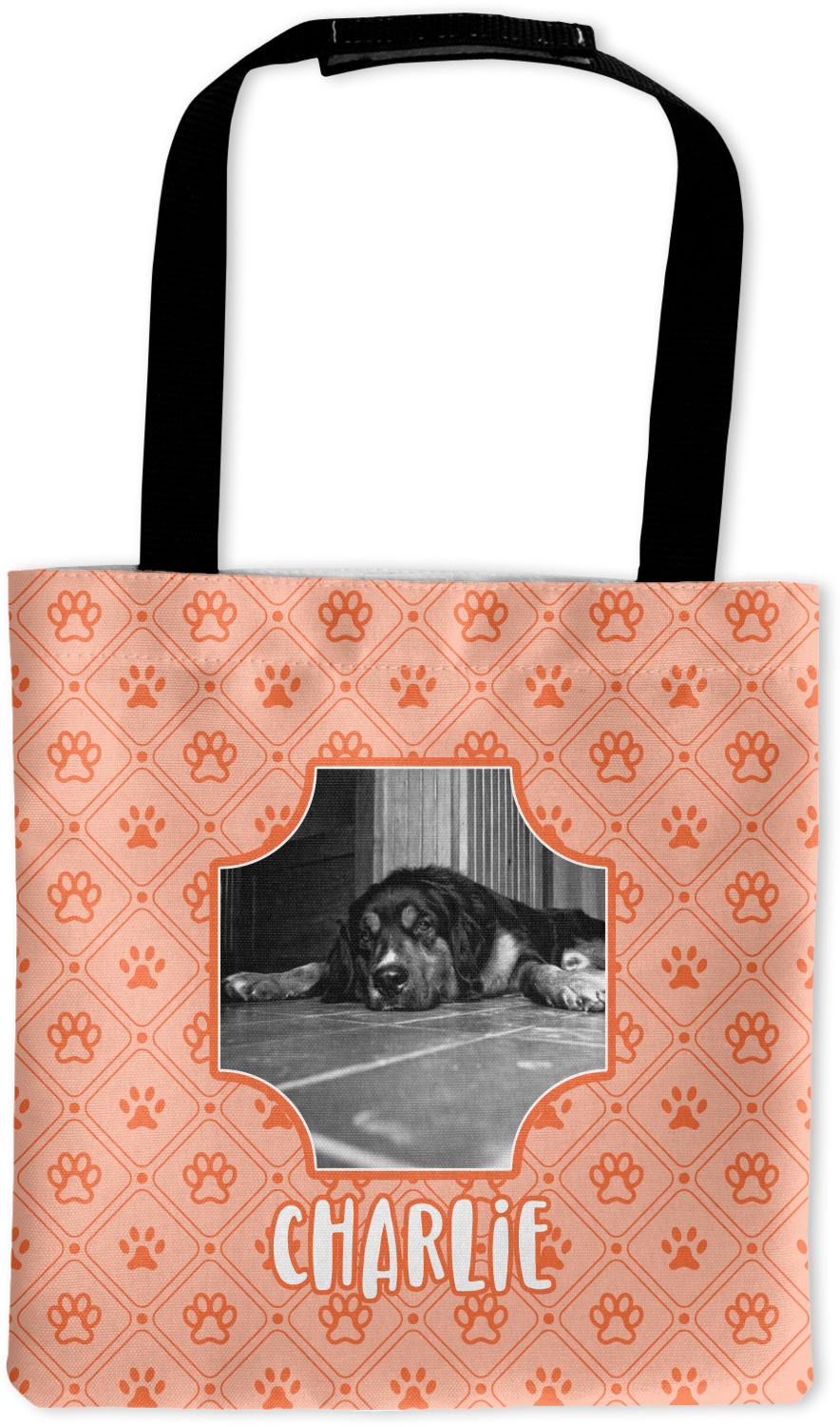 This design is a bright peach with accents of orange. In the middle, you can upload your favorite picture of your pet! It's a breeze with our design center. Underneath their picture, put their name or a fun saying. The background is filled with a fun pattern of pawprints and bones. This will be the perfect design for a sweet puppy.