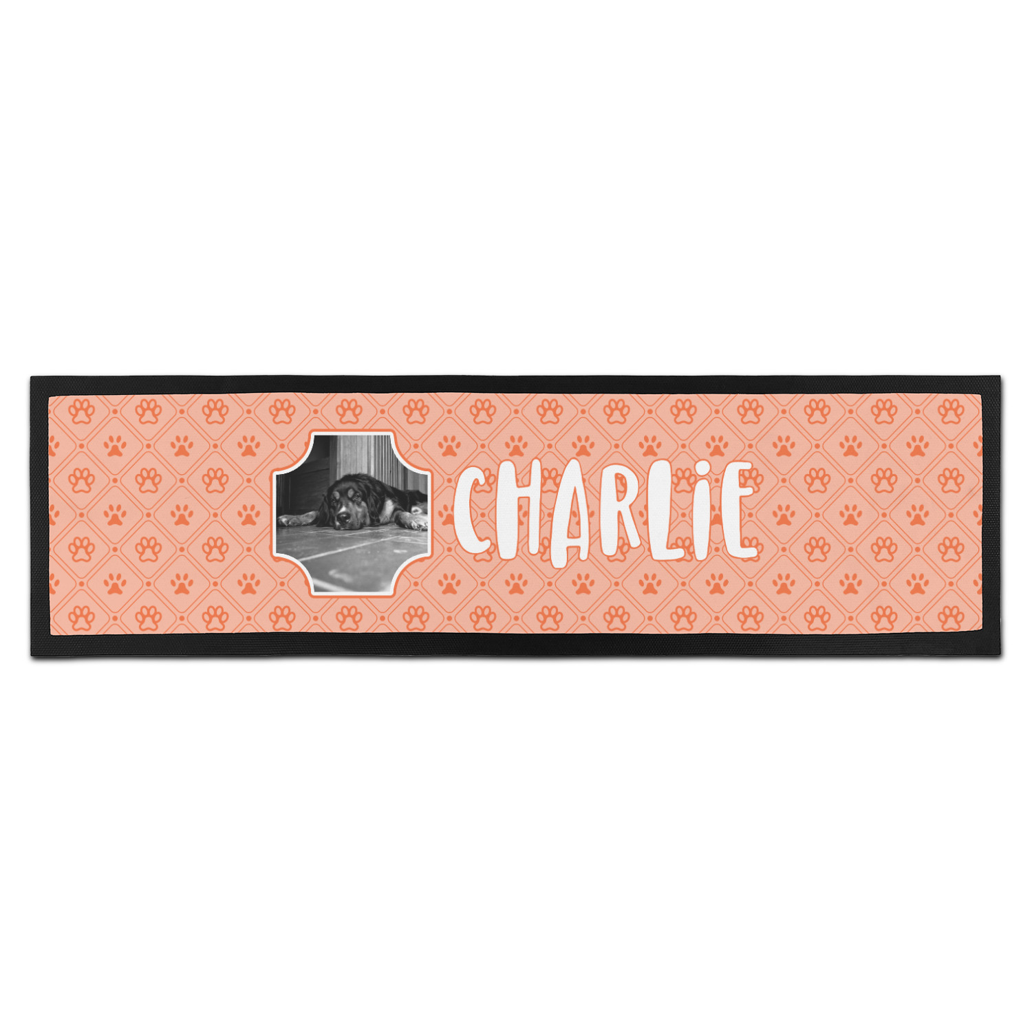 This design is a bright peach with accents of orange. In the middle, you can upload your favorite picture of your pet! It's a breeze with our design center. Underneath their picture, put their name or a fun saying. The background is filled with a fun pattern of pawprints and bones. This will be the perfect design for a sweet puppy.