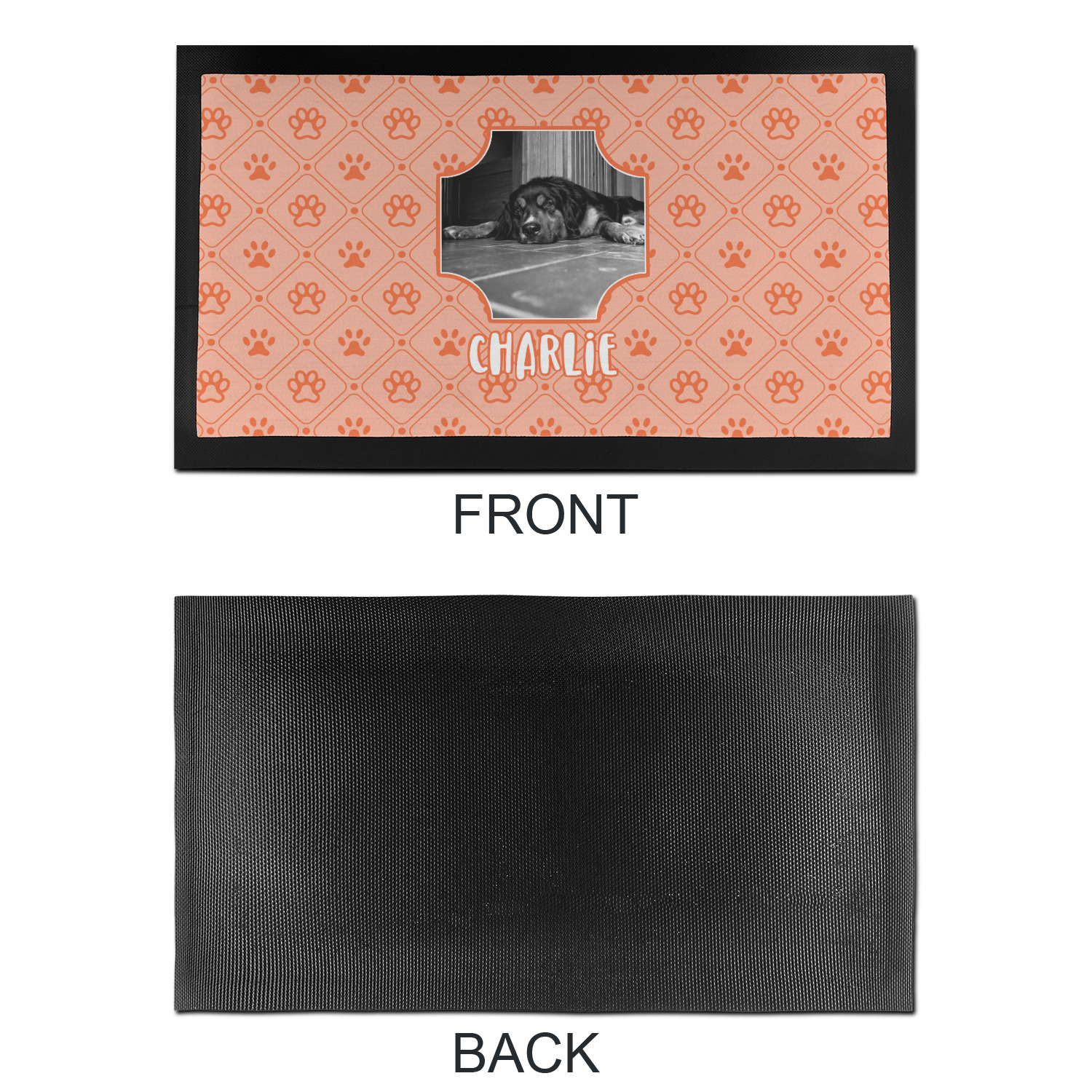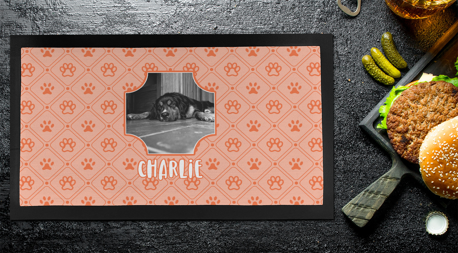 This design is a bright peach with accents of orange. In the middle, you can upload your favorite picture of your pet! It's a breeze with our design center. Underneath their picture, put their name or a fun saying. The background is filled with a fun pattern of pawprints and bones. This will be the perfect design for a sweet puppy.