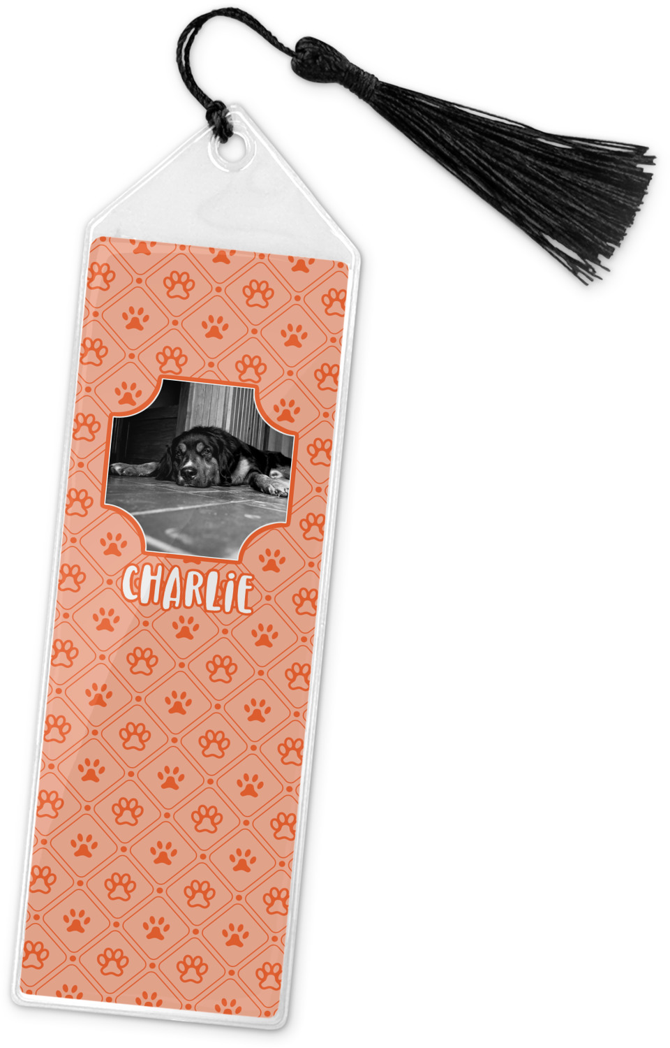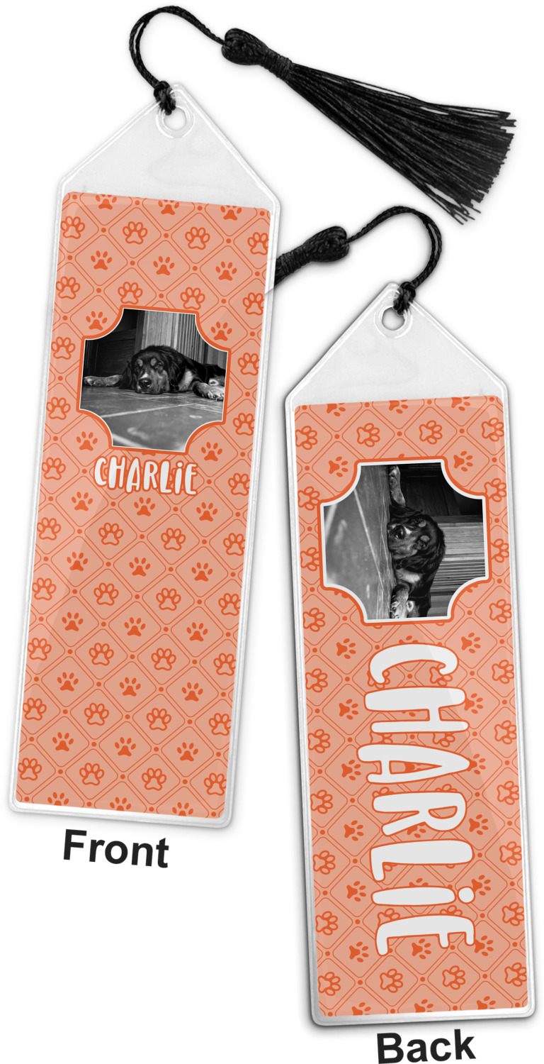 Your personalized bookmark is made of a sturdy, clear vinyl, and is approximately 7.5" x 2.25". We display your personalization on vinyl inserts that are placed on both sides. Accompanying each book marker is a black, fringe tassel that attaches to the reinforced, triangular header.