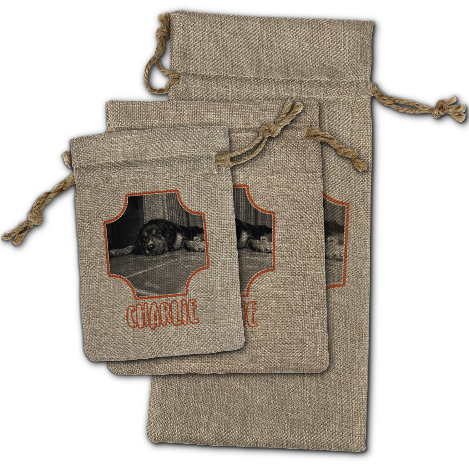 We sell our Burlap Gift Bags in 3 variant sized bags. Made with burlap polyester, each personalized bag can be secured with a twine drawstring pull. Your custom design is available to print on one side or both sides - completely up to you! The sizes of the bags measure approximately 4.5" x 6.5" for the smallest size, 6.5" x 8.0" for the medium size, and 6.5" x 13.5" for the large-sized bag.