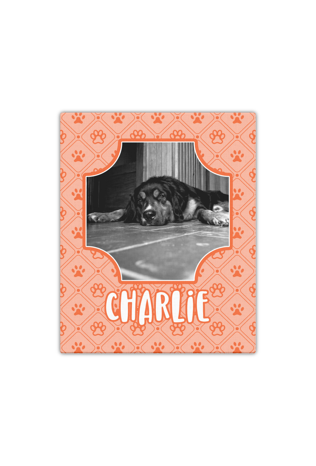 This design is a bright peach with accents of orange. In the middle, you can upload your favorite picture of your pet! It's a breeze with our design center. Underneath their picture, put their name or a fun saying. The background is filled with a fun pattern of pawprints and bones. This will be the perfect design for a sweet puppy.