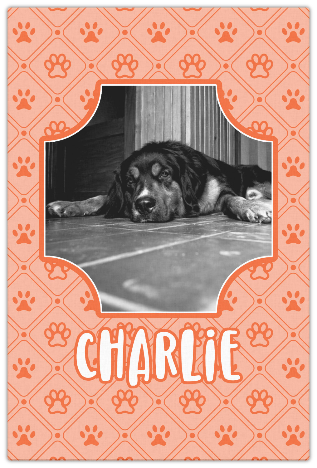 This design is a bright peach with accents of orange. In the middle, you can upload your favorite picture of your pet! It's a breeze with our design center. Underneath their picture, put their name or a fun saying. The background is filled with a fun pattern of pawprints and bones. This will be the perfect design for a sweet puppy.