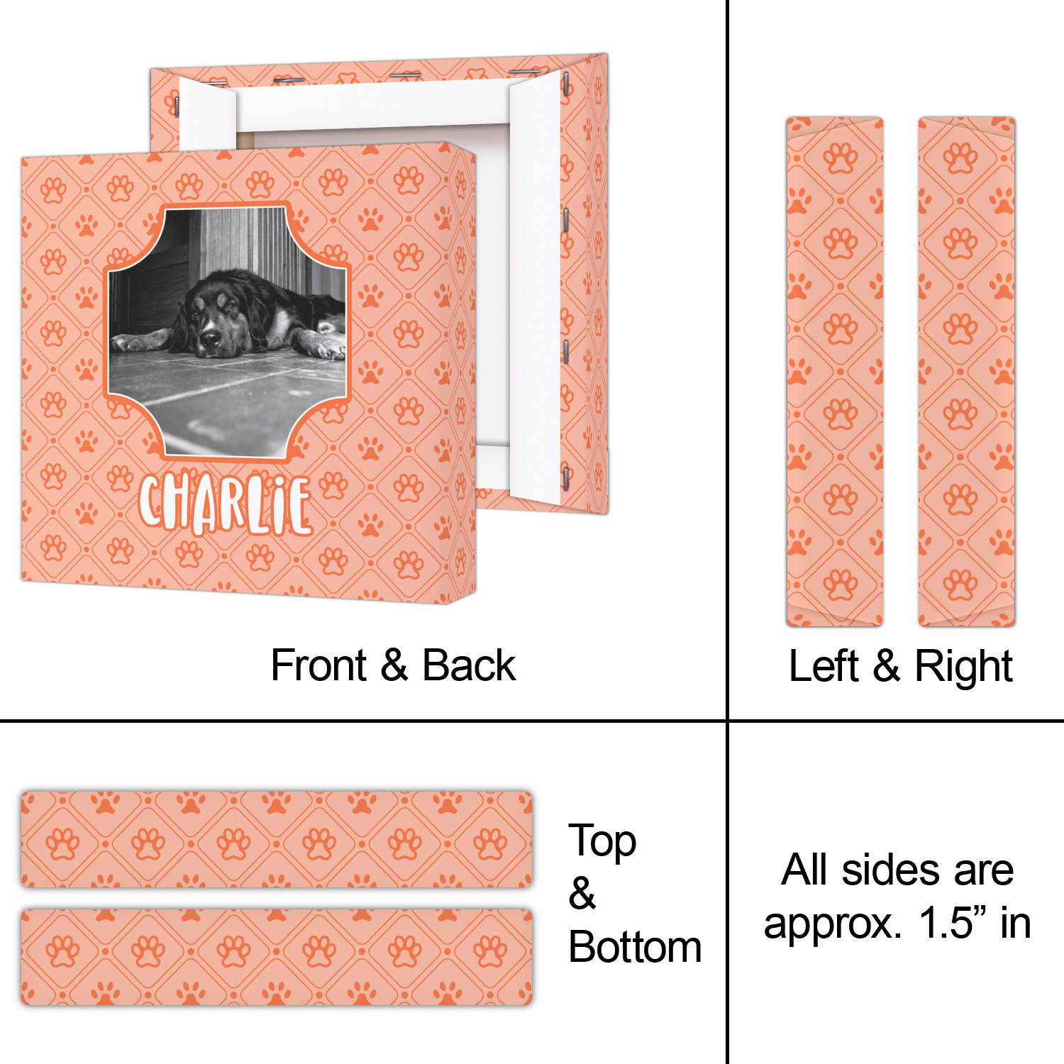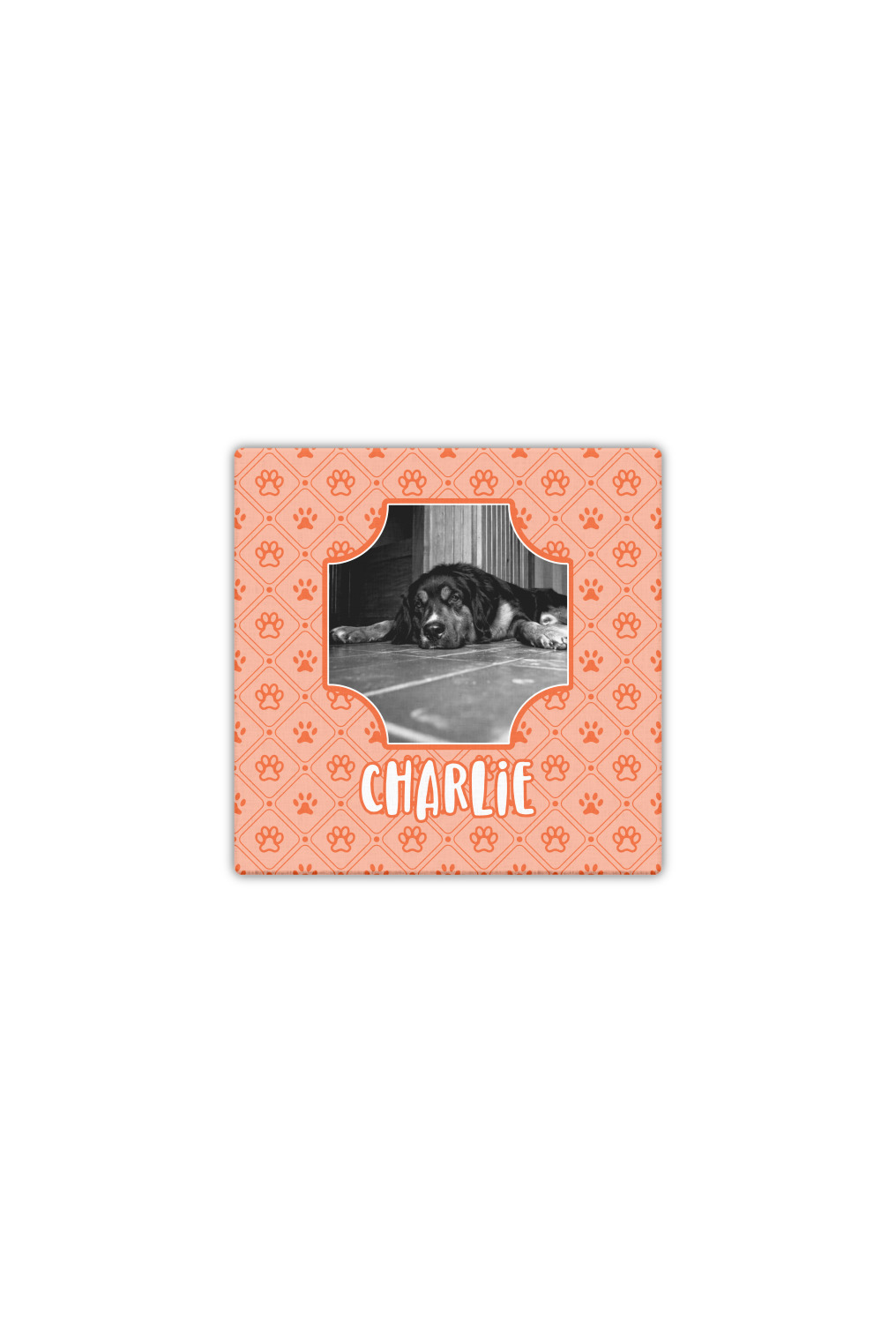 This design is a bright peach with accents of orange. In the middle, you can upload your favorite picture of your pet! It's a breeze with our design center. Underneath their picture, put their name or a fun saying. The background is filled with a fun pattern of pawprints and bones. This will be the perfect design for a sweet puppy.