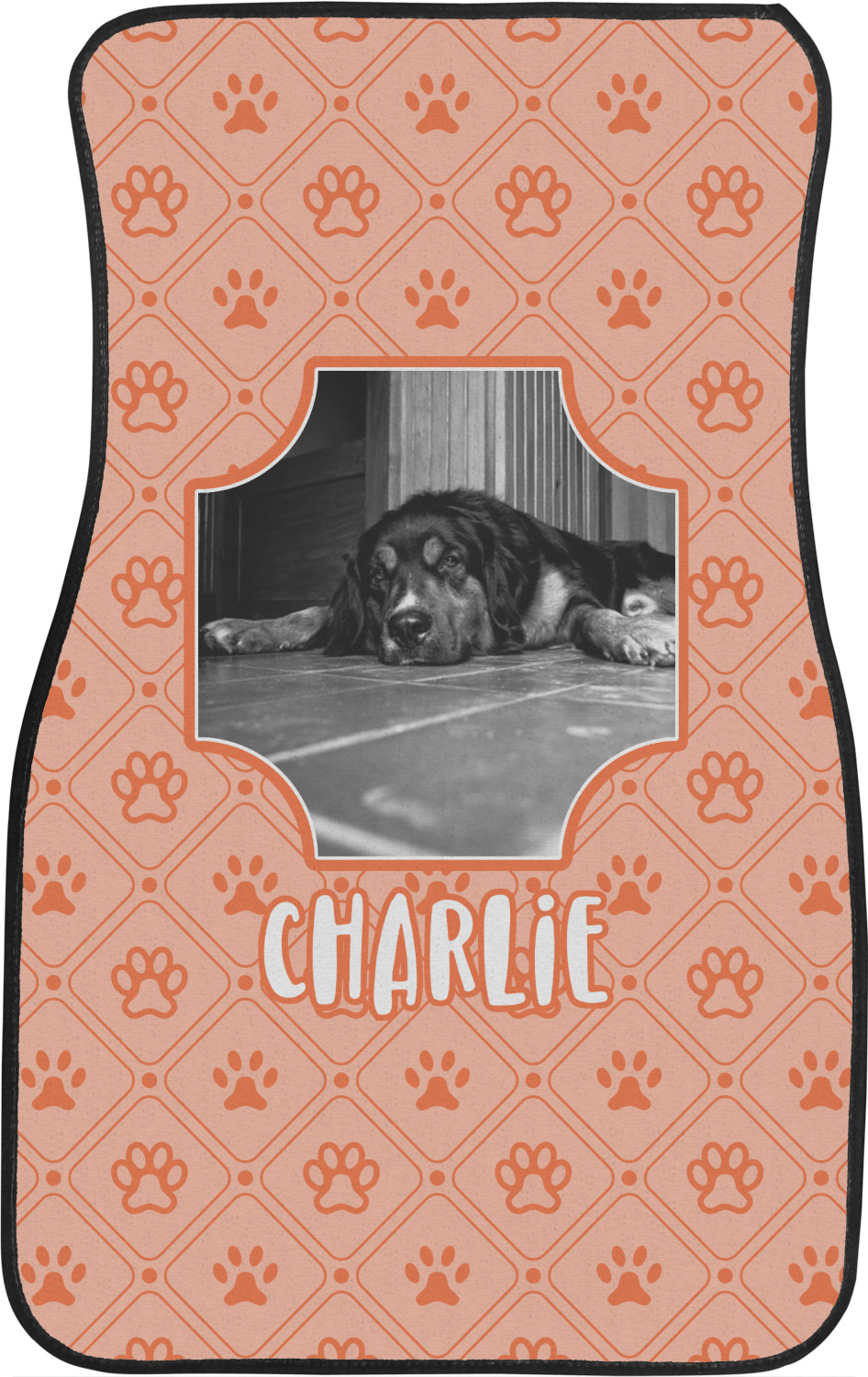 This design is a bright peach with accents of orange. In the middle, you can upload your favorite picture of your pet! It's a breeze with our design center. Underneath their picture, put their name or a fun saying. The background is filled with a fun pattern of pawprints and bones. This will be the perfect design for a sweet puppy.