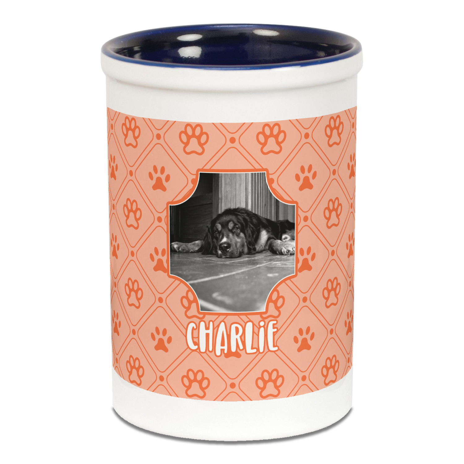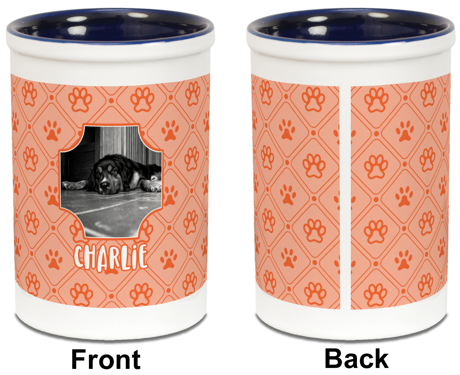 This design is a bright peach with accents of orange. In the middle, you can upload your favorite picture of your pet! It's a breeze with our design center. Underneath their picture, put their name or a fun saying. The background is filled with a fun pattern of pawprints and bones. This will be the perfect design for a sweet puppy.