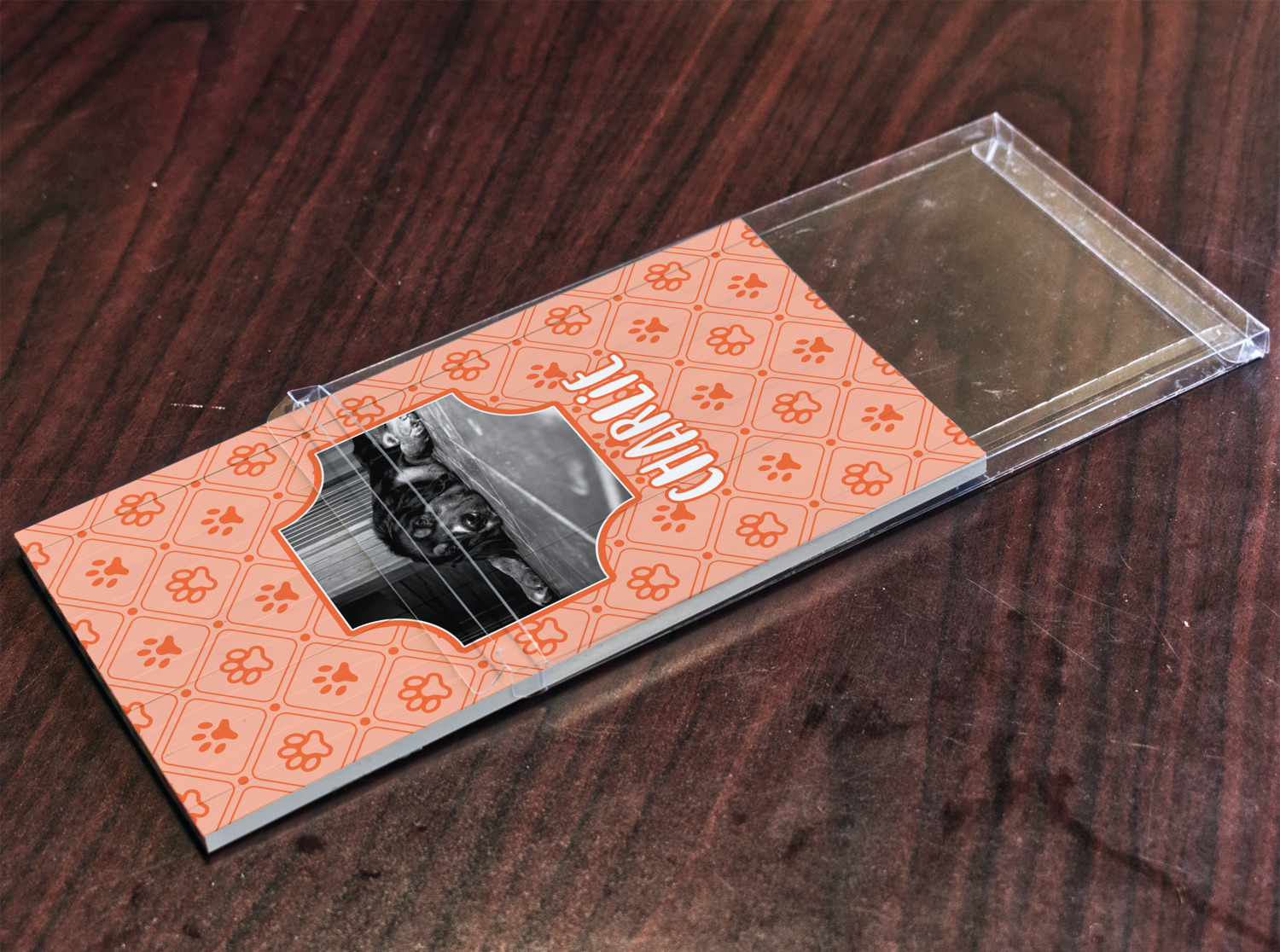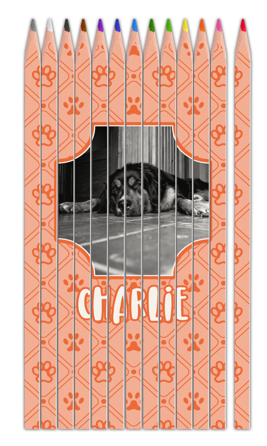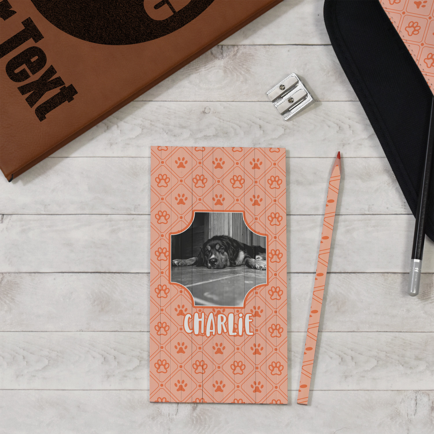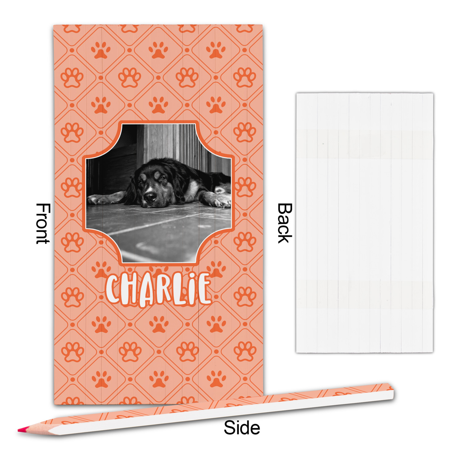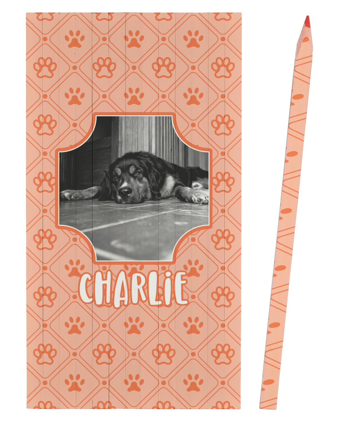 This design is a bright peach with accents of orange. In the middle, you can upload your favorite picture of your pet! It's a breeze with our design center. Underneath their picture, put their name or a fun saying. The background is filled with a fun pattern of pawprints and bones. This will be the perfect design for a sweet puppy.