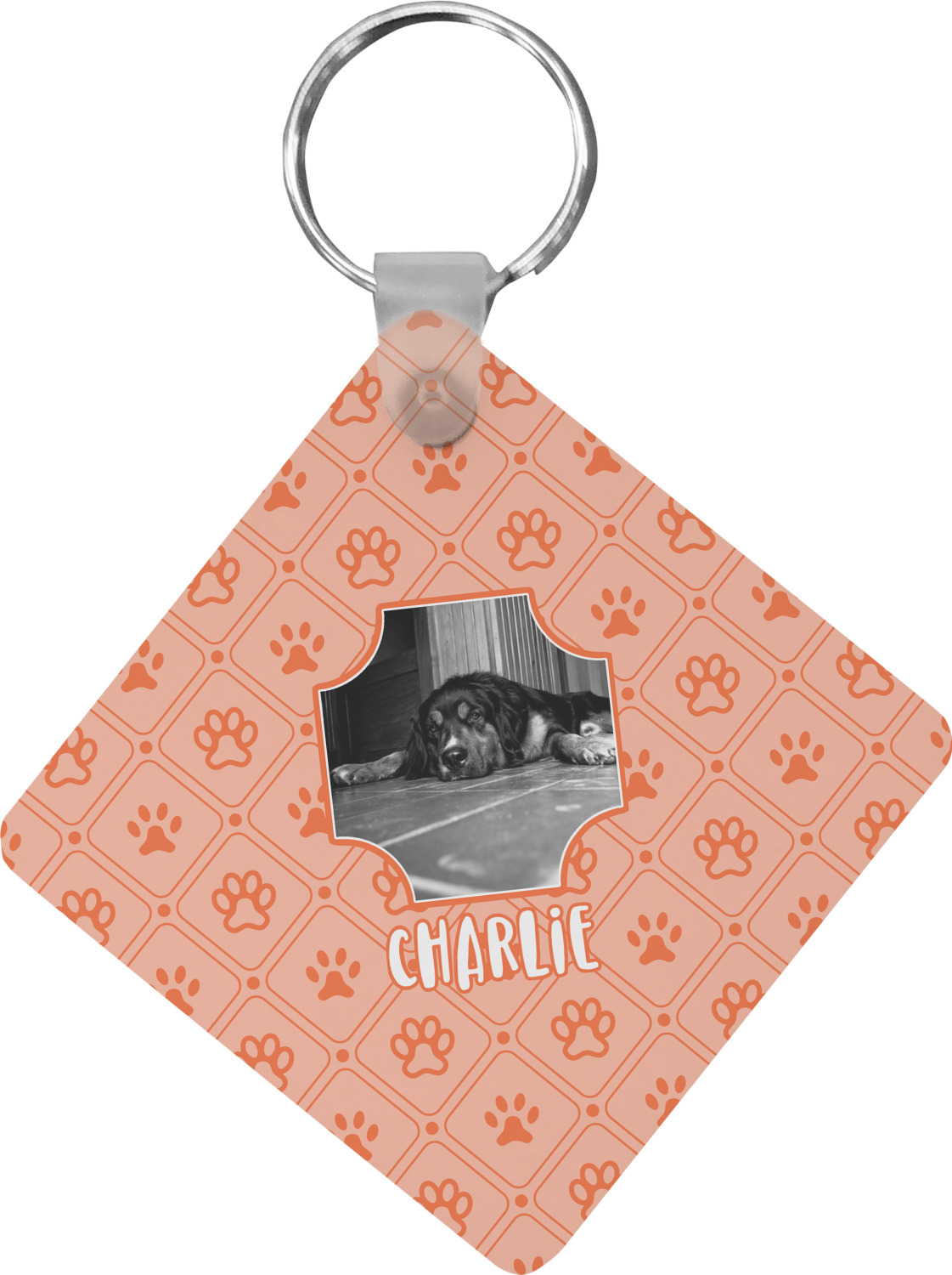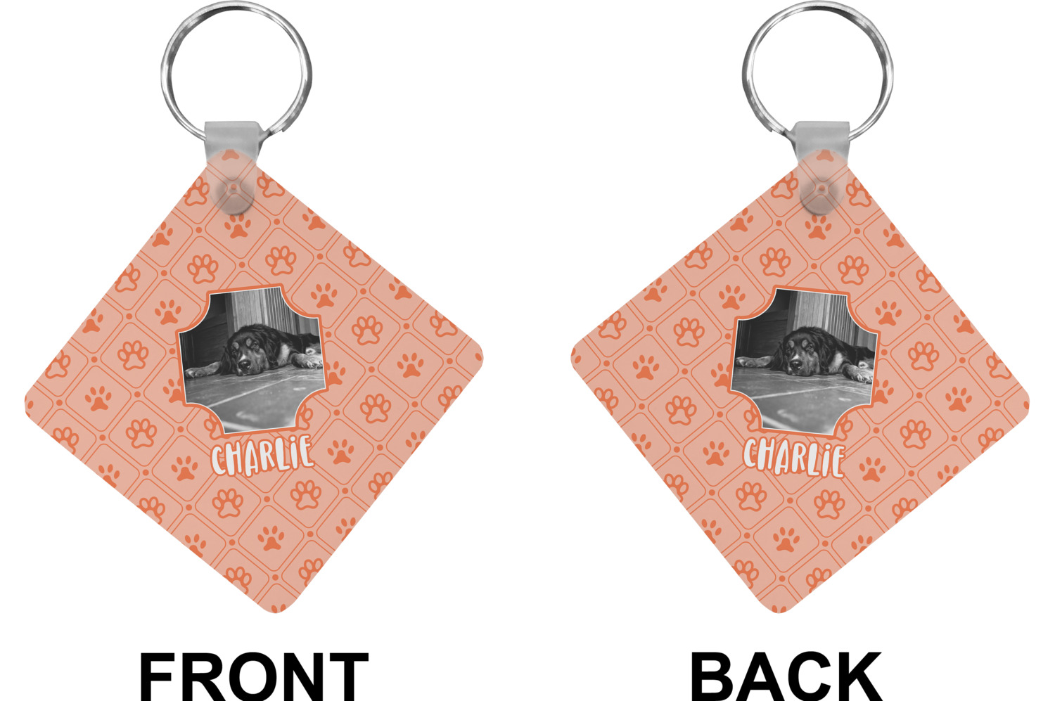 Our personalized keychains attach to the included metal, split key ring with a plastic, removable snap. Since a metal ring is included with your purchase, you have the liberty to keep your keys together on the ring, with or without your unique keychain. We offer this keychain in three different shapes: circle, heart, or diamond. We print your personalized design(s) on both sides of the key chain, and the surface has a glossy, reflective finish that only emphasizes your design. Each keychain is approximately 2.25 by 2.25 inches.