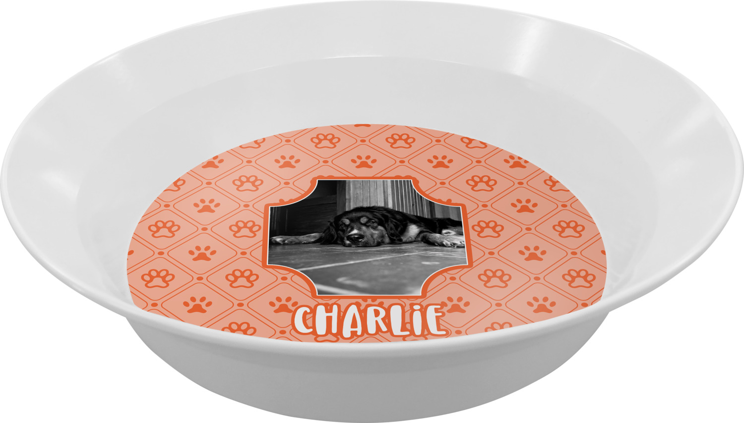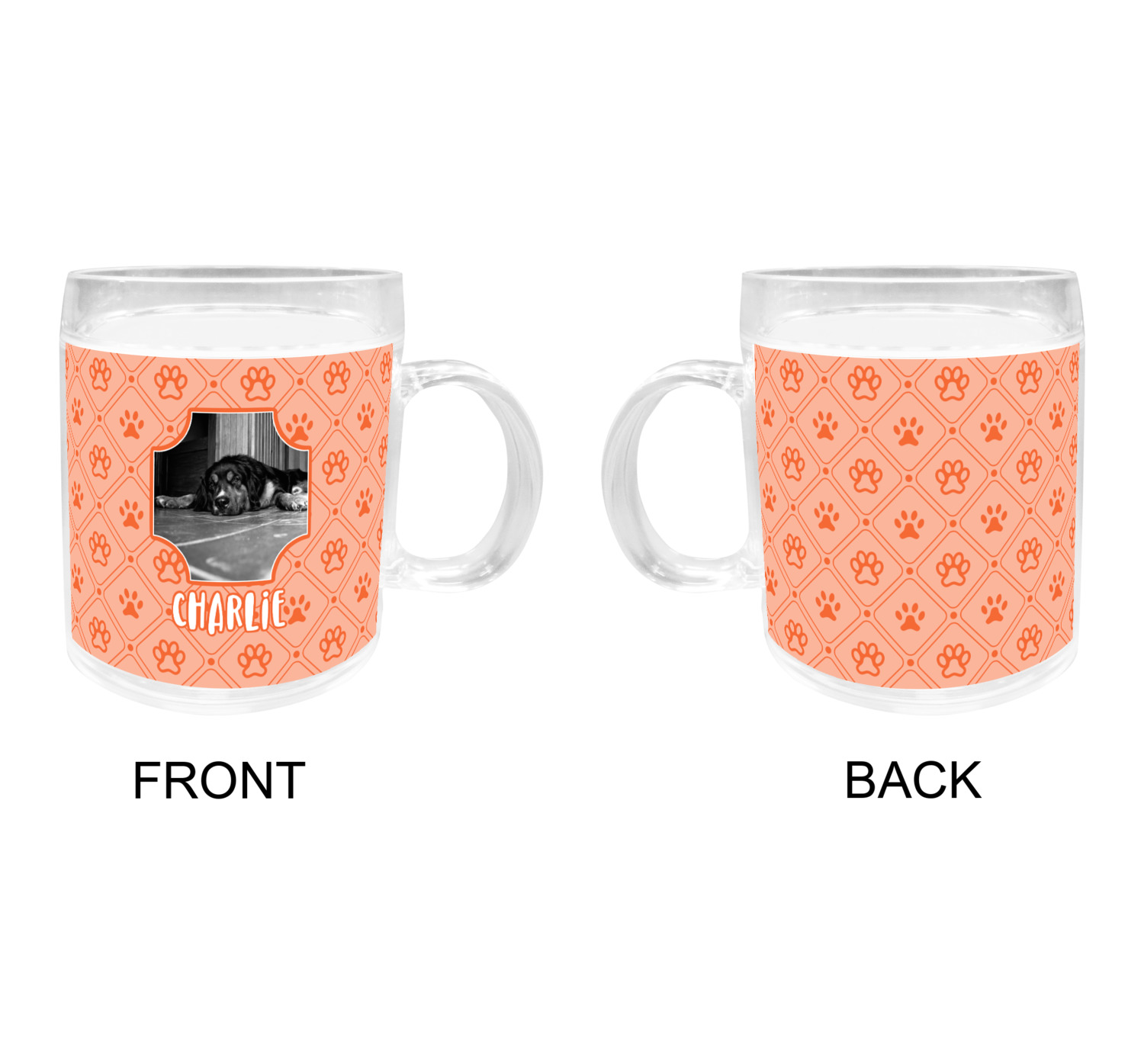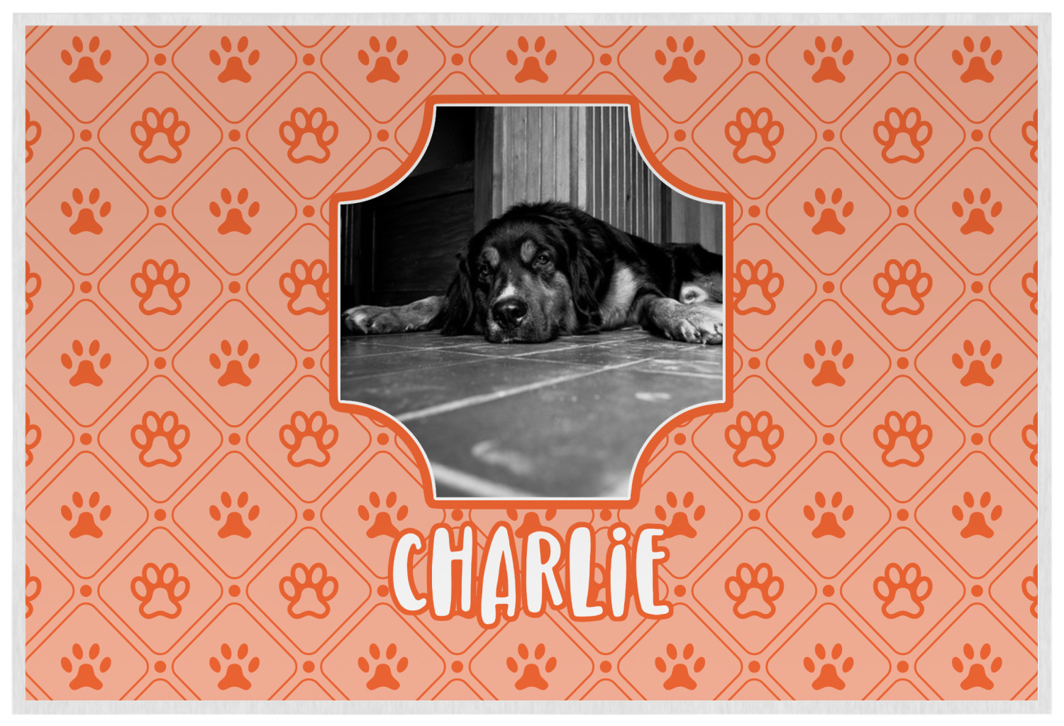 This design is a bright peach with accents of orange. In the middle, you can upload your favorite picture of your pet! It's a breeze with our design center. Underneath their picture, put their name or a fun saying. The background is filled with a fun pattern of pawprints and bones. This will be the perfect design for a sweet puppy.