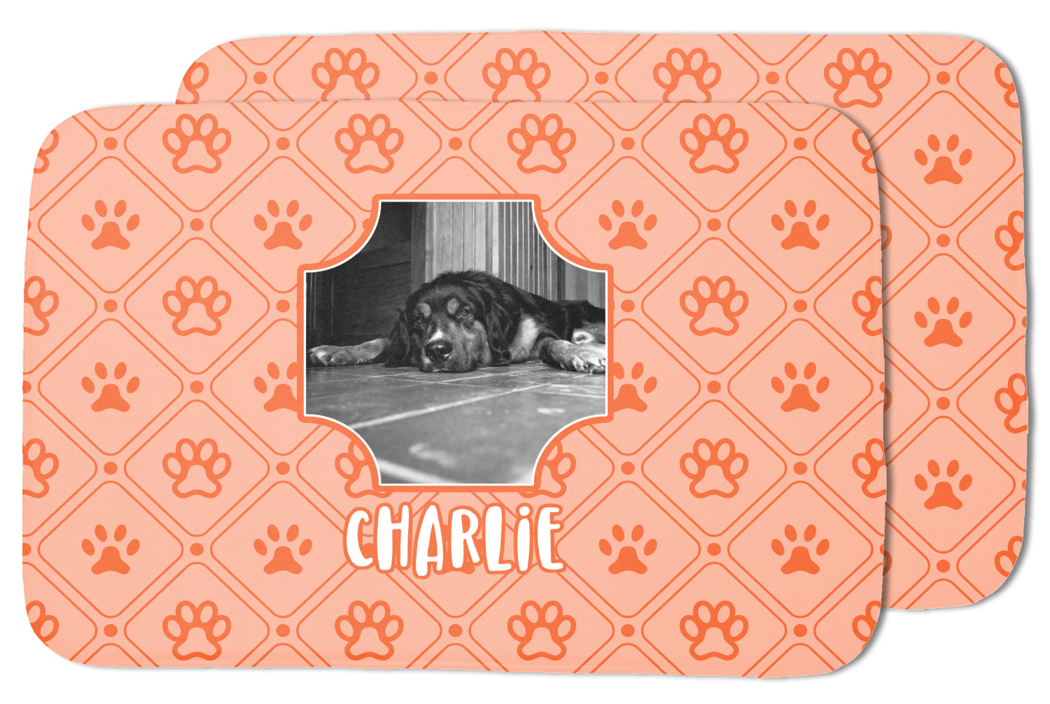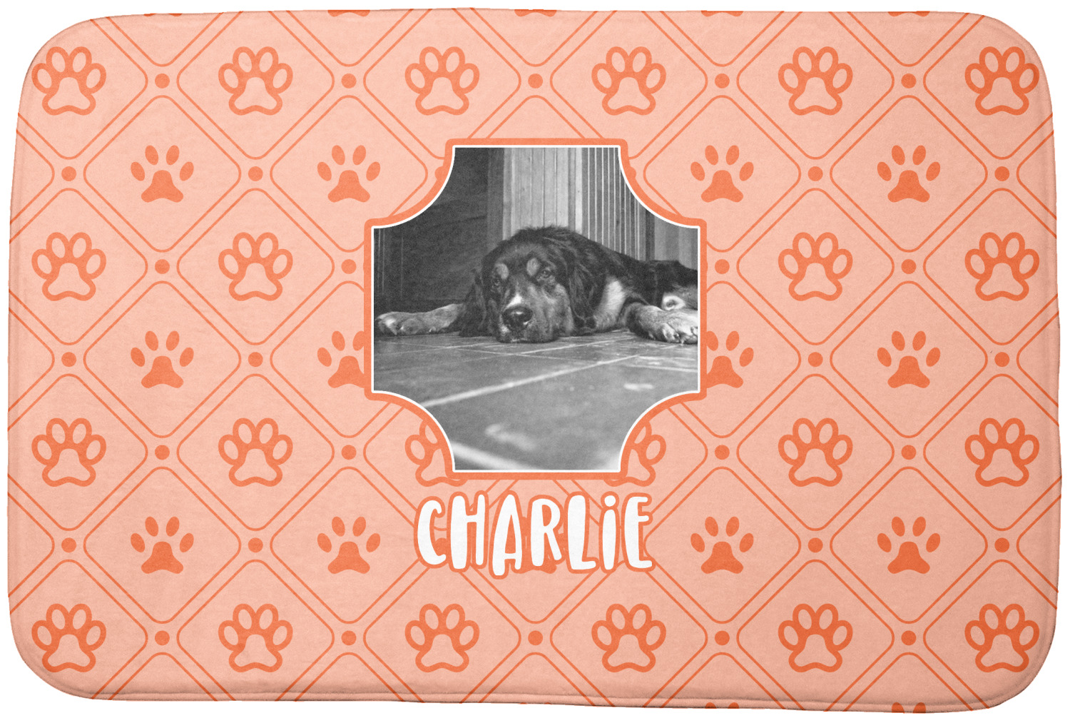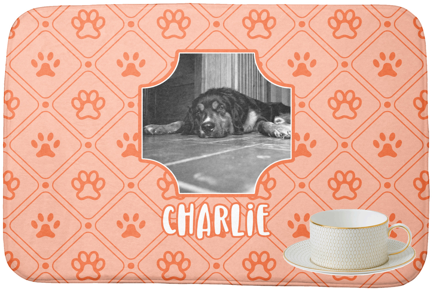 This design is a bright peach with accents of orange. In the middle, you can upload your favorite picture of your pet! It's a breeze with our design center. Underneath their picture, put their name or a fun saying. The background is filled with a fun pattern of pawprints and bones. This will be the perfect design for a sweet puppy.
