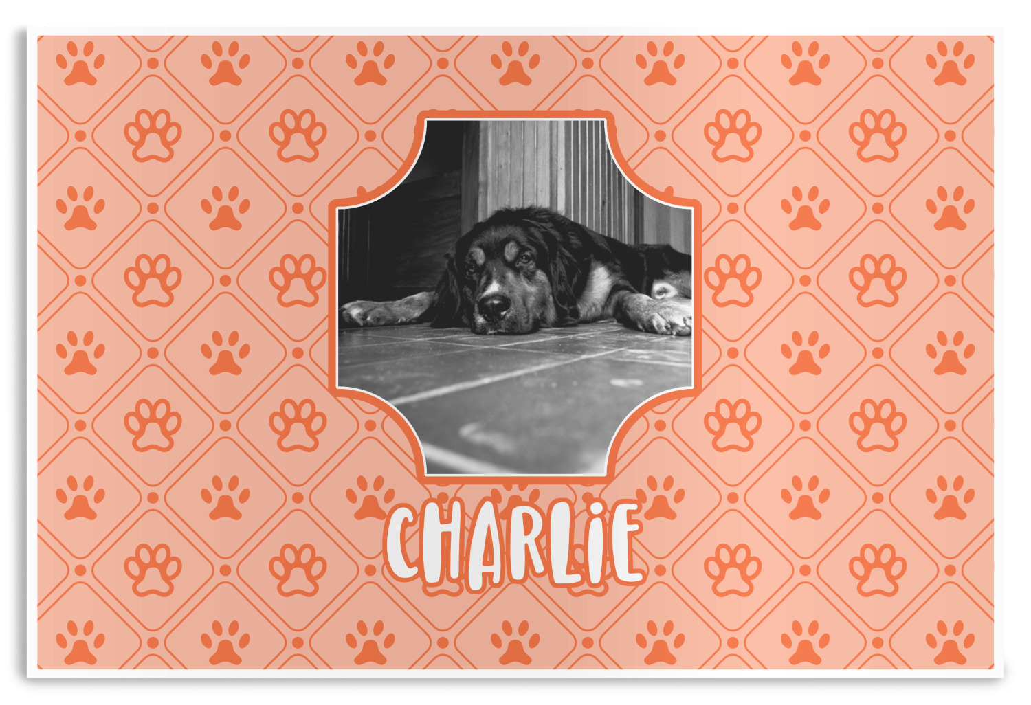 This design is a bright peach with accents of orange. In the middle, you can upload your favorite picture of your pet! It's a breeze with our design center. Underneath their picture, put their name or a fun saying. The background is filled with a fun pattern of pawprints and bones. This will be the perfect design for a sweet puppy.