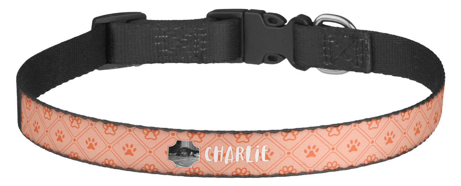 This sturdy collar, made from a durable nylon weave, will outlive your dog's episodes of excited tugging and pulling. Courtesy of its thick plastic buckle and adjuster, this collar is adjustable and accommodating of any dog. Structurally, the collar is a single piece of nylon weave that is sewn together, and features a solid metal loop where you can attach a leash or dog tag. We print and display your dog's name and pattern across the middle of the personalized dog collar.