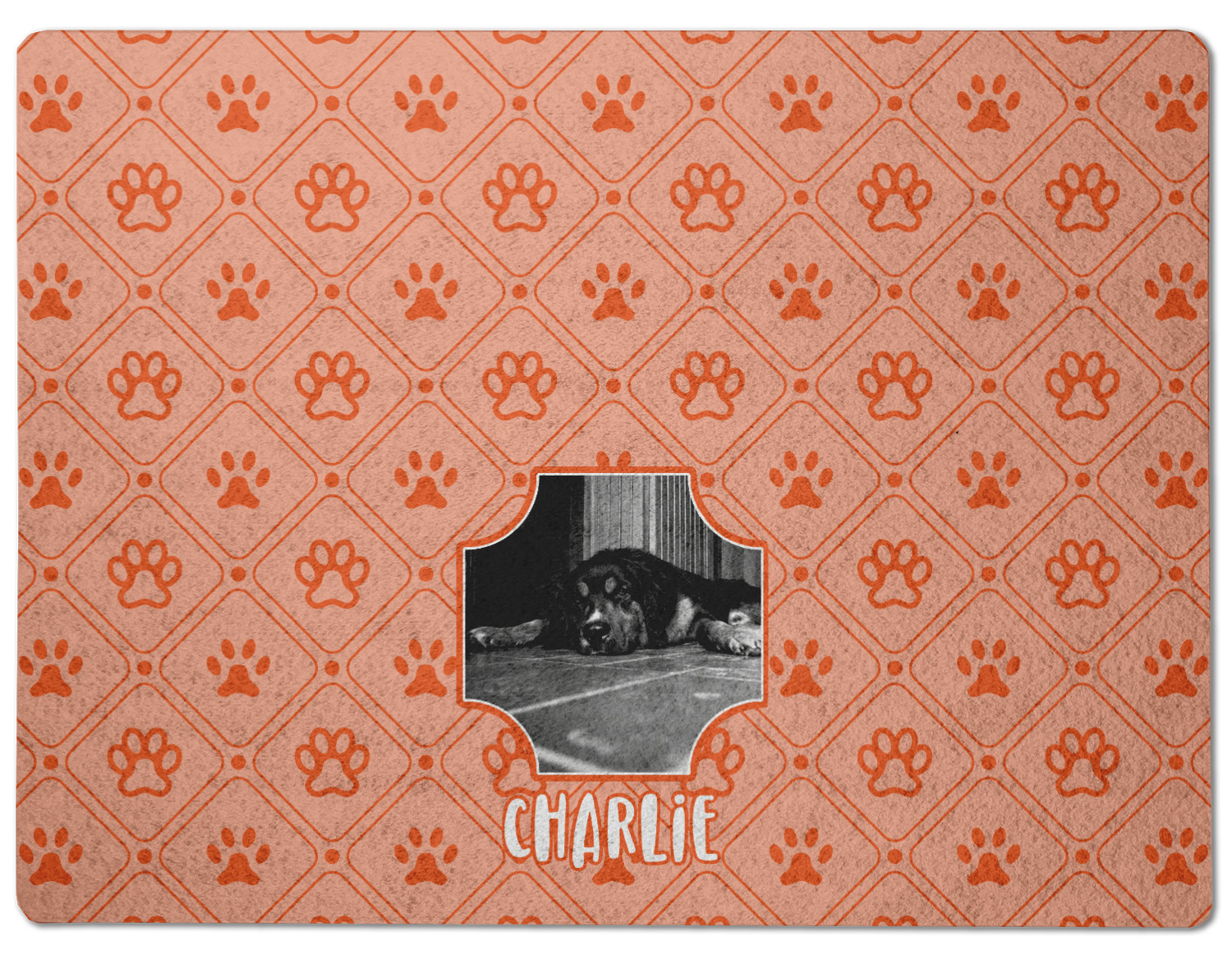 This design is a bright peach with accents of orange. In the middle, you can upload your favorite picture of your pet! It's a breeze with our design center. Underneath their picture, put their name or a fun saying. The background is filled with a fun pattern of pawprints and bones. This will be the perfect design for a sweet puppy.