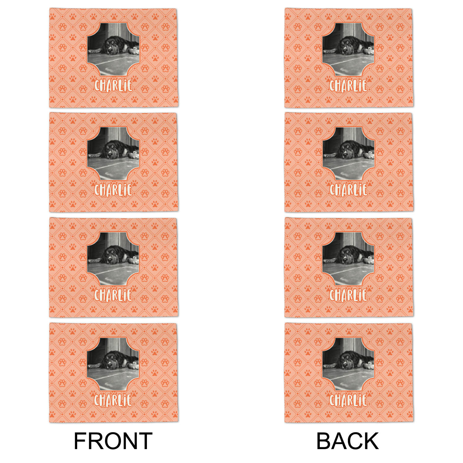 This design is a bright peach with accents of orange. In the middle, you can upload your favorite picture of your pet! It's a breeze with our design center. Underneath their picture, put their name or a fun saying. The background is filled with a fun pattern of pawprints and bones. This will be the perfect design for a sweet puppy.
