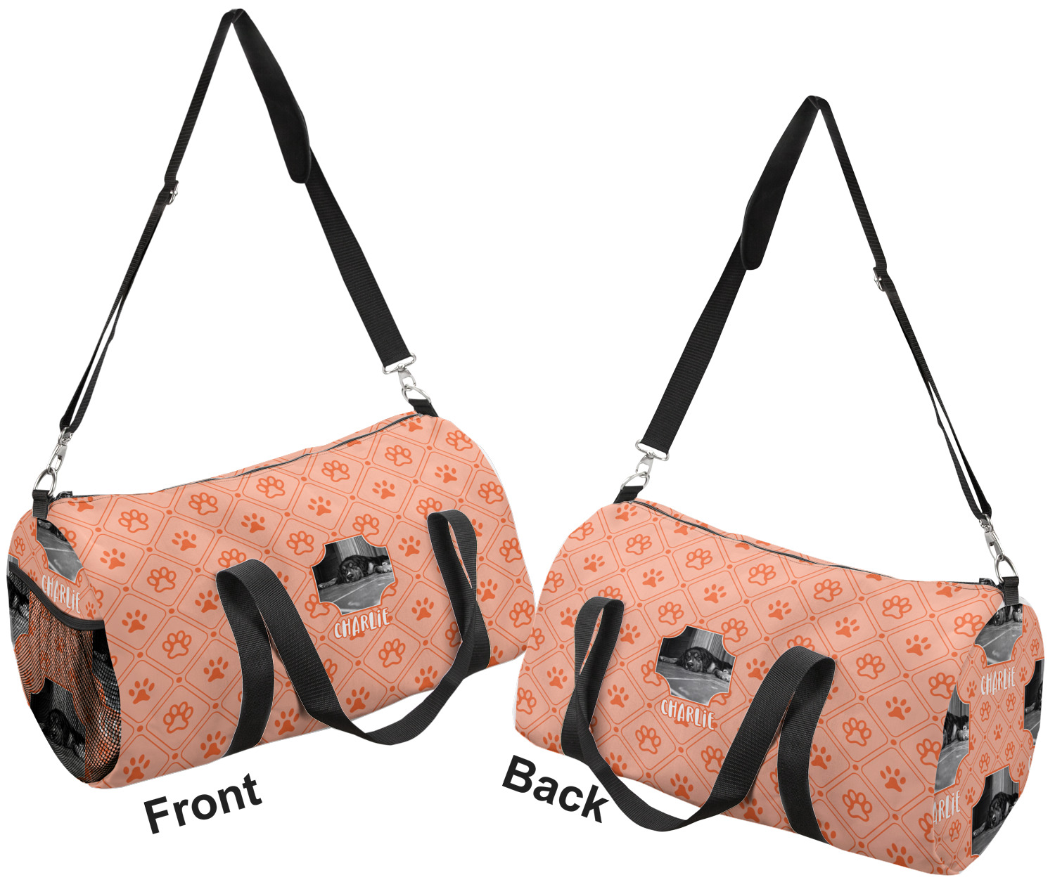 This duffle is a sturdy bag made of a canvas material. It comes in two sizes: Small (19"W x 9.5"H x 9.5"D) and Large (23"W x 12"H x 12"D). The bag is a cylindrical shape with a black adjustable strap and two handles. On one side is an elastic pouch to put a waterbottle or other small item. Your product will be sublimated with your design and is able to be designed on the front, back, and sides. Be sure to remember that the straps may cut into parts of your design if you upload your own artwork.