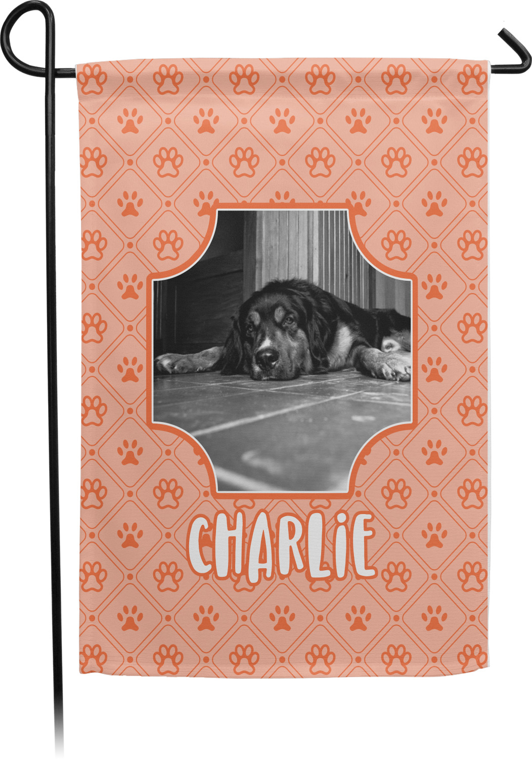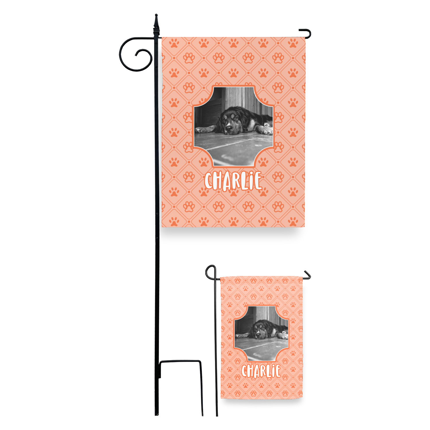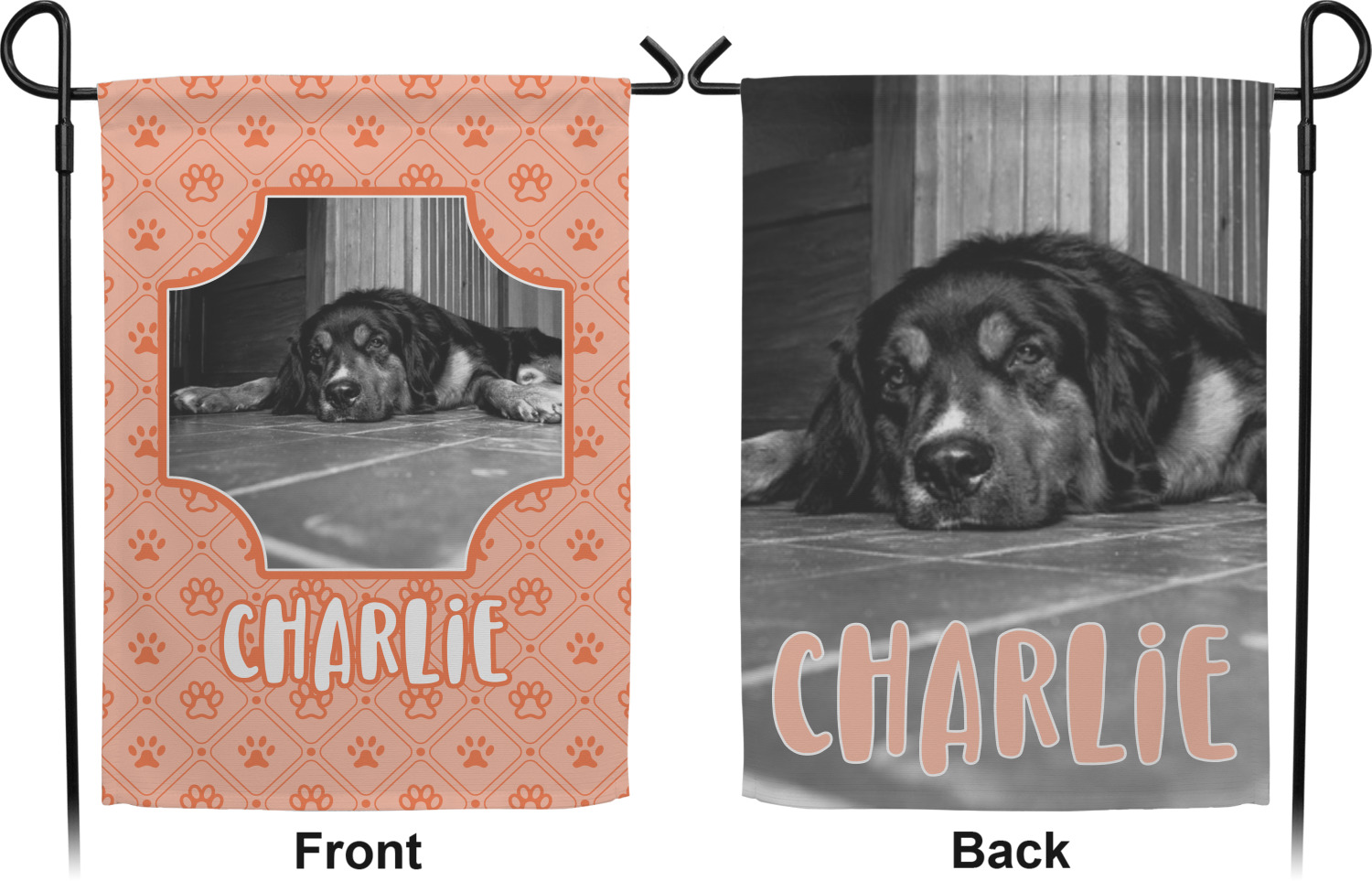 These custom garden flags are made of a durable, double-ply, polyester weave, allowing them to withstand the elements year round. The small flags measure at approximately 12 by 18 inches. The large flags measure out to 28 by 37 inches. You can order these decorative flags with your customization printed on the front only, or the front and back.