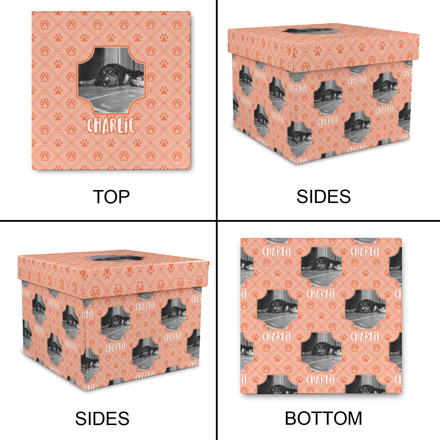 This design is a bright peach with accents of orange. In the middle, you can upload your favorite picture of your pet! It's a breeze with our design center. Underneath their picture, put their name or a fun saying. The background is filled with a fun pattern of pawprints and bones. This will be the perfect design for a sweet puppy.
