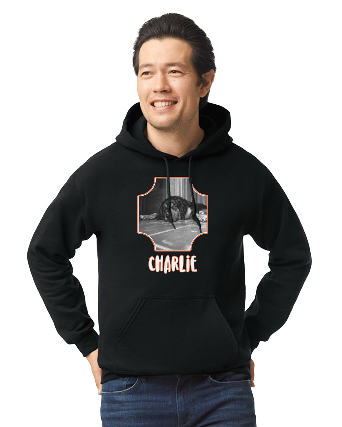 This design is a bright peach with accents of orange. In the middle, you can upload your favorite picture of your pet! It's a breeze with our design center. Underneath their picture, put their name or a fun saying. The background is filled with a fun pattern of pawprints and bones. This will be the perfect design for a sweet puppy.