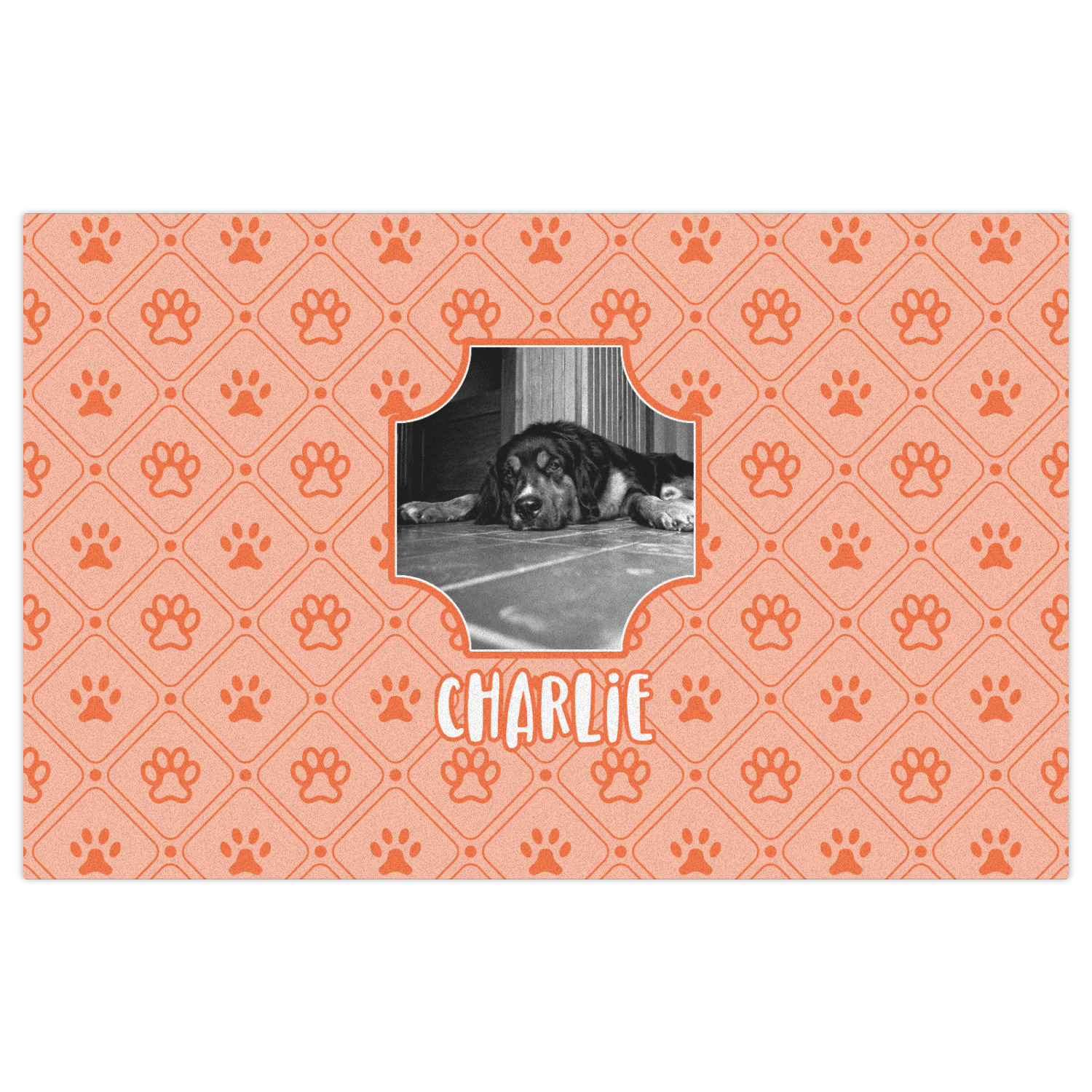 This design is a bright peach with accents of orange. In the middle, you can upload your favorite picture of your pet! It's a breeze with our design center. Underneath their picture, put their name or a fun saying. The background is filled with a fun pattern of pawprints and bones. This will be the perfect design for a sweet puppy.