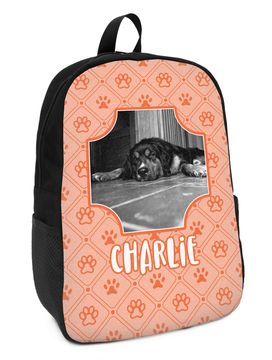 This design is a bright peach with accents of orange. In the middle, you can upload your favorite picture of your pet! It's a breeze with our design center. Underneath their picture, put their name or a fun saying. The background is filled with a fun pattern of pawprints and bones. This will be the perfect design for a sweet puppy.