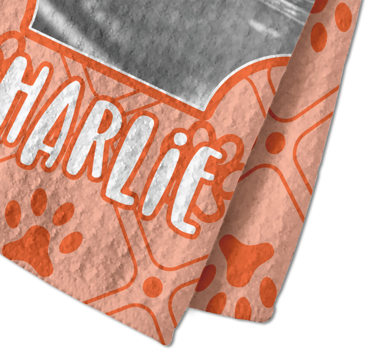 This design is a bright peach with accents of orange. In the middle, you can upload your favorite picture of your pet! It's a breeze with our design center. Underneath their picture, put their name or a fun saying. The background is filled with a fun pattern of pawprints and bones. This will be the perfect design for a sweet puppy.