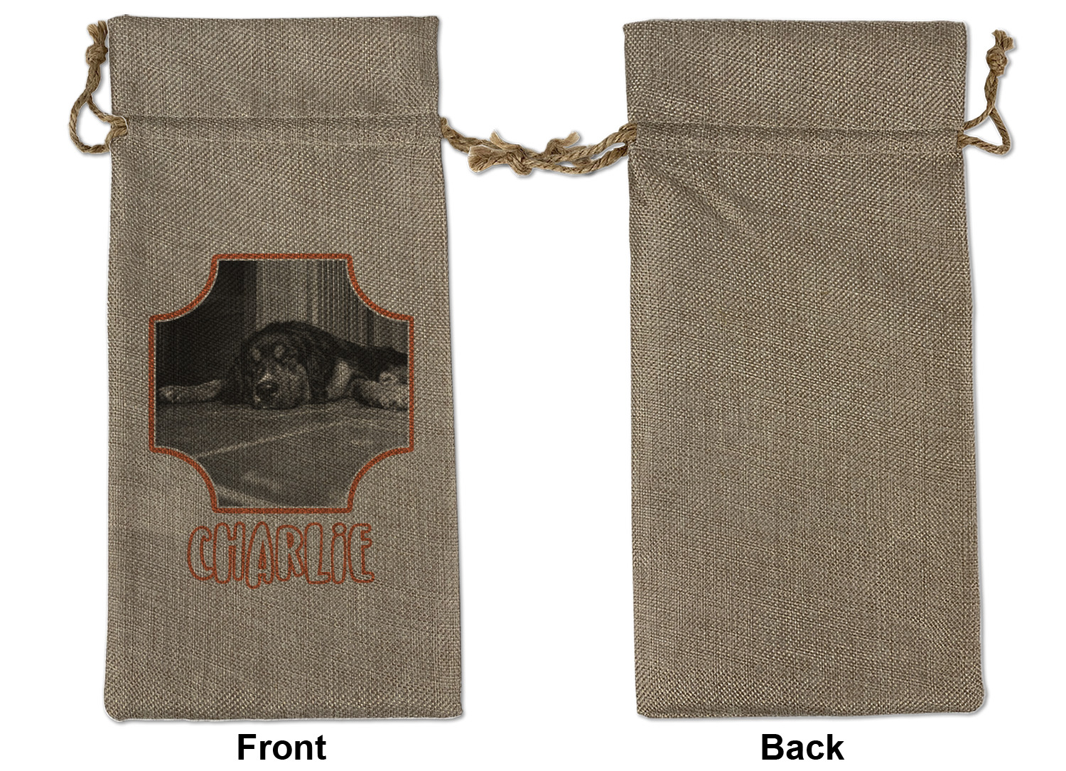 We sell our Burlap Gift Bags in 3 variant sized bags. Made with burlap polyester, each personalized bag can be secured with a twine drawstring pull. Your custom design is available to print on one side or both sides - completely up to you! The sizes of the bags measure approximately 4.5" x 6.5" for the smallest size, 6.5" x 8.0" for the medium size, and 6.5" x 13.5" for the large-sized bag.