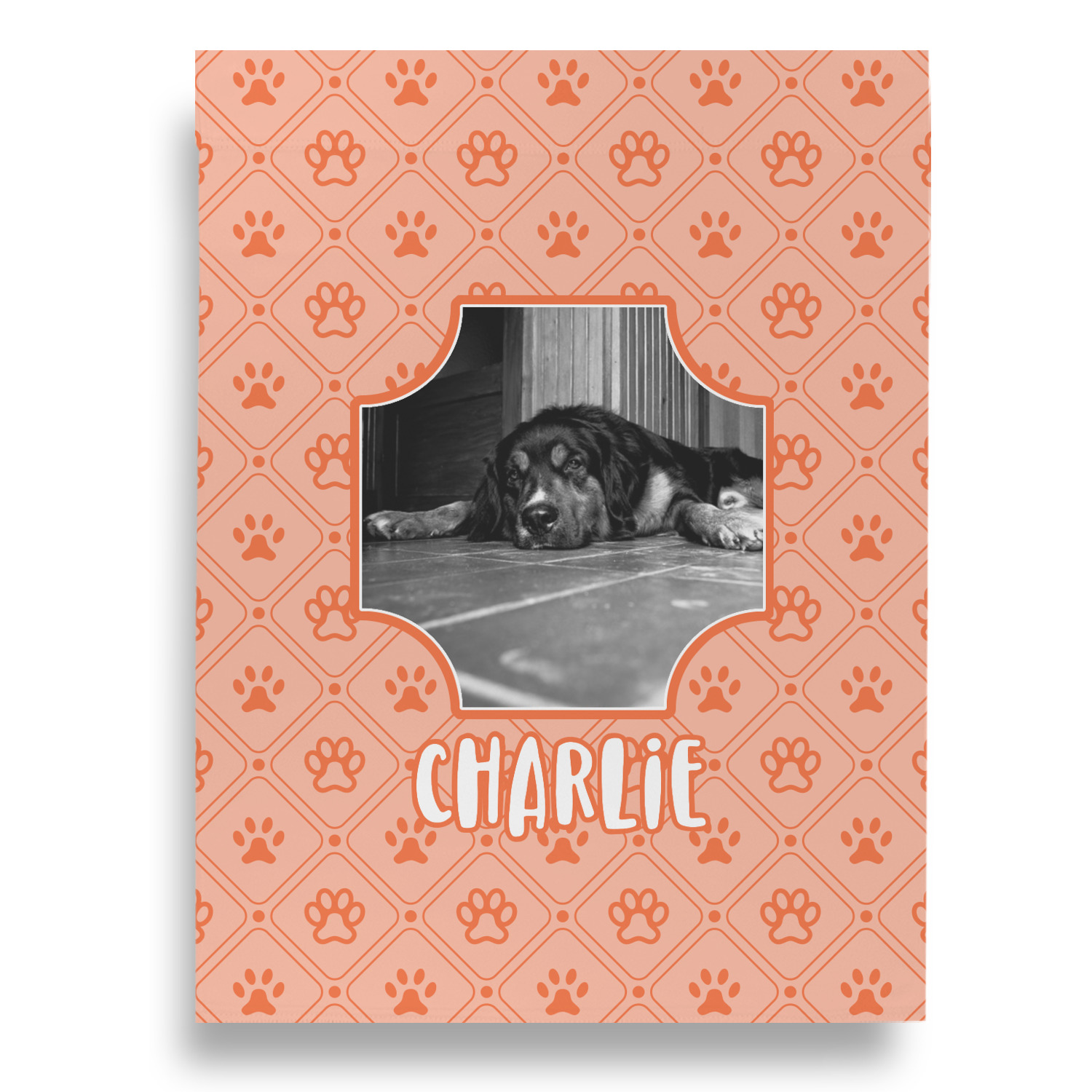 This design is a bright peach with accents of orange. In the middle, you can upload your favorite picture of your pet! It's a breeze with our design center. Underneath their picture, put their name or a fun saying. The background is filled with a fun pattern of pawprints and bones. This will be the perfect design for a sweet puppy.