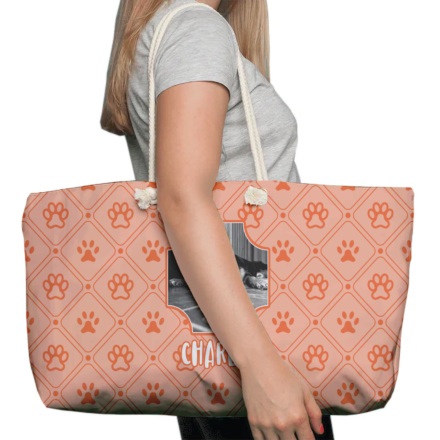 These weekender totes can be customized front and back. The totes are full all over print - so the choice of how background are endless - from beautiful floral or leaf patterns to geometrics or some classic Van Gogh artwork - the possibilities are endless. The totes can also be decorated with photos and logos.