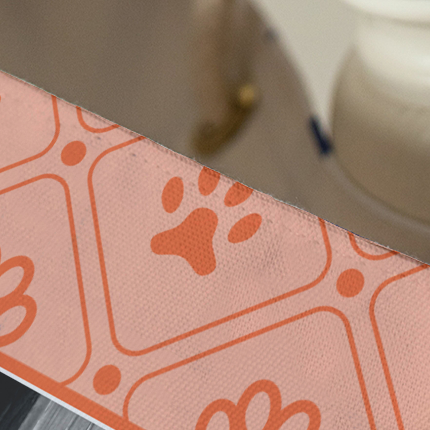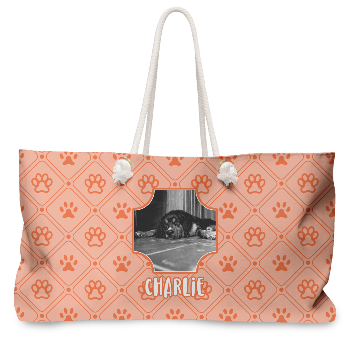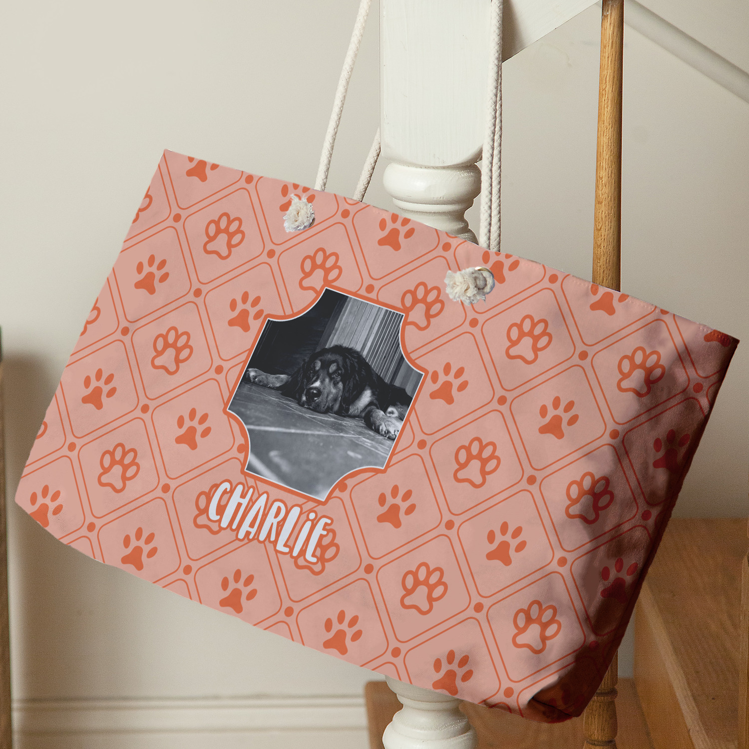 This design is a bright peach with accents of orange. In the middle, you can upload your favorite picture of your pet! It's a breeze with our design center. Underneath their picture, put their name or a fun saying. The background is filled with a fun pattern of pawprints and bones. This will be the perfect design for a sweet puppy.