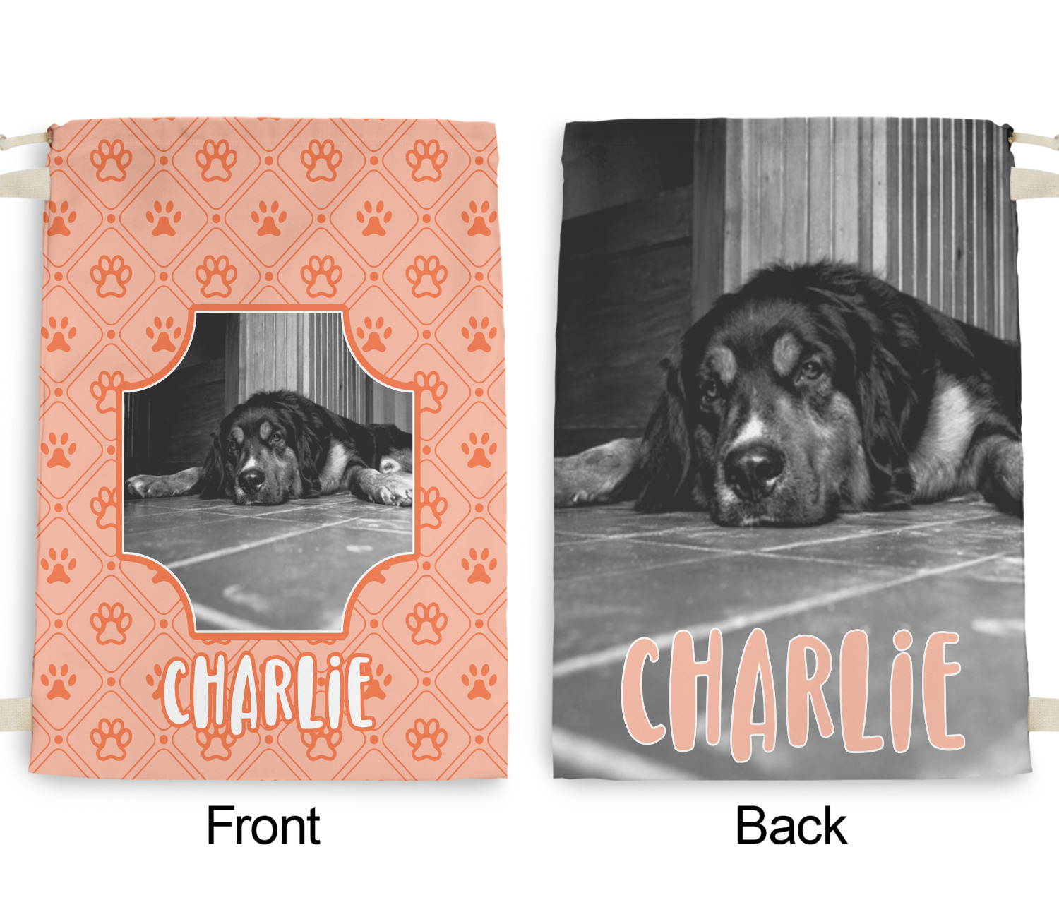 This design is a bright peach with accents of orange. In the middle, you can upload your favorite picture of your pet! It's a breeze with our design center. Underneath their picture, put their name or a fun saying. The background is filled with a fun pattern of pawprints and bones. This will be the perfect design for a sweet puppy.