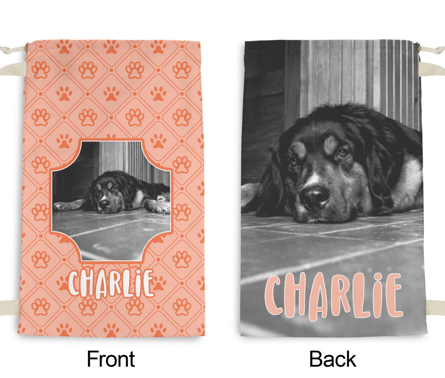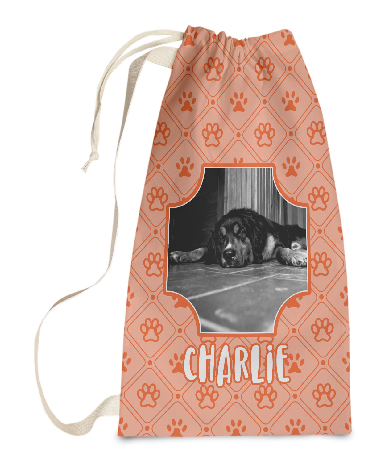 Carry your laundry in style with these customized laundry bags. Available in two sizes, featuring a natural colored woven strap and a cinch cord, these bags hold a lot of clothes or anything else you want to fit in them.